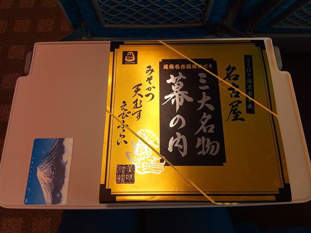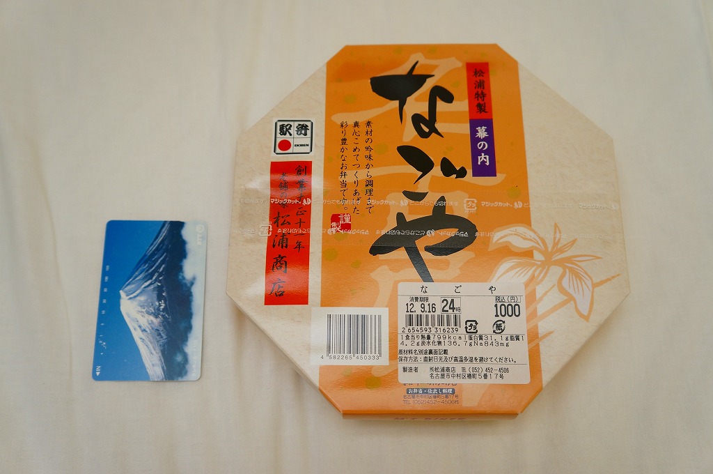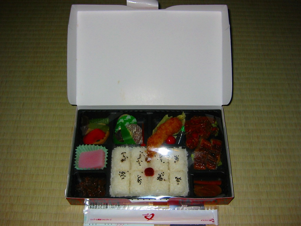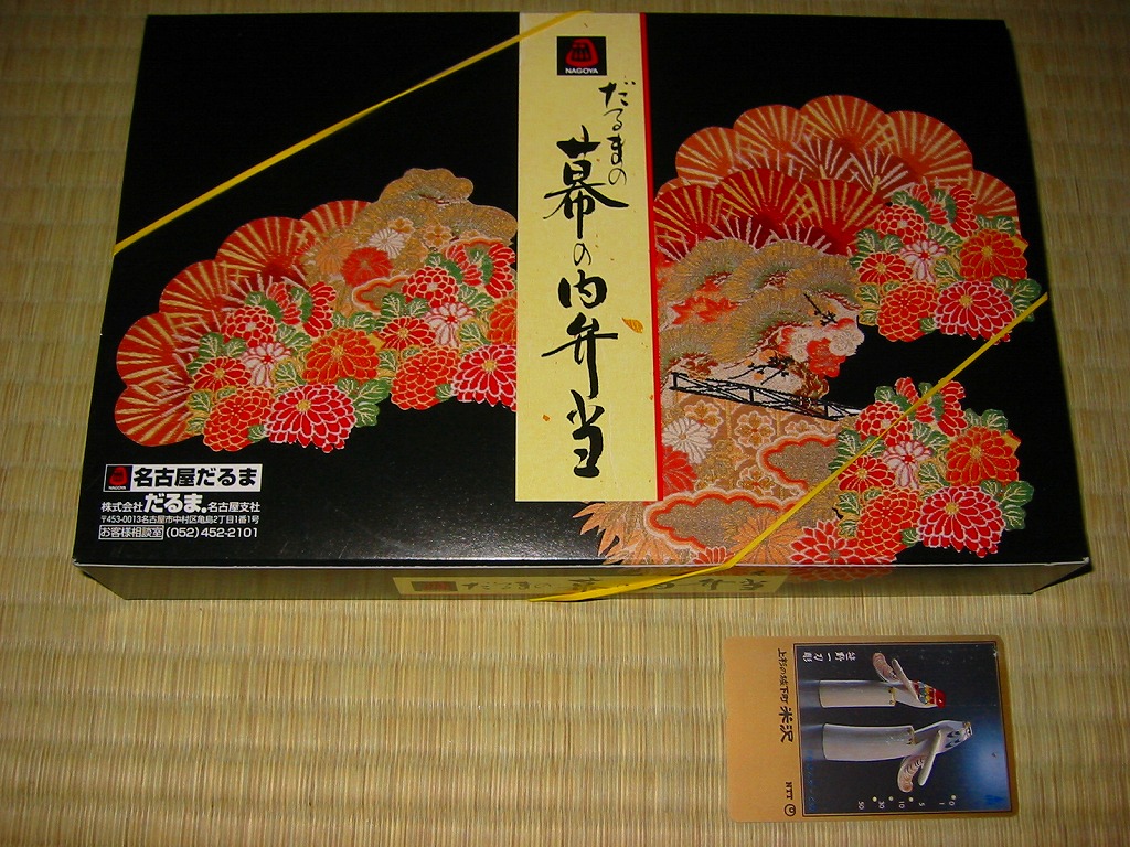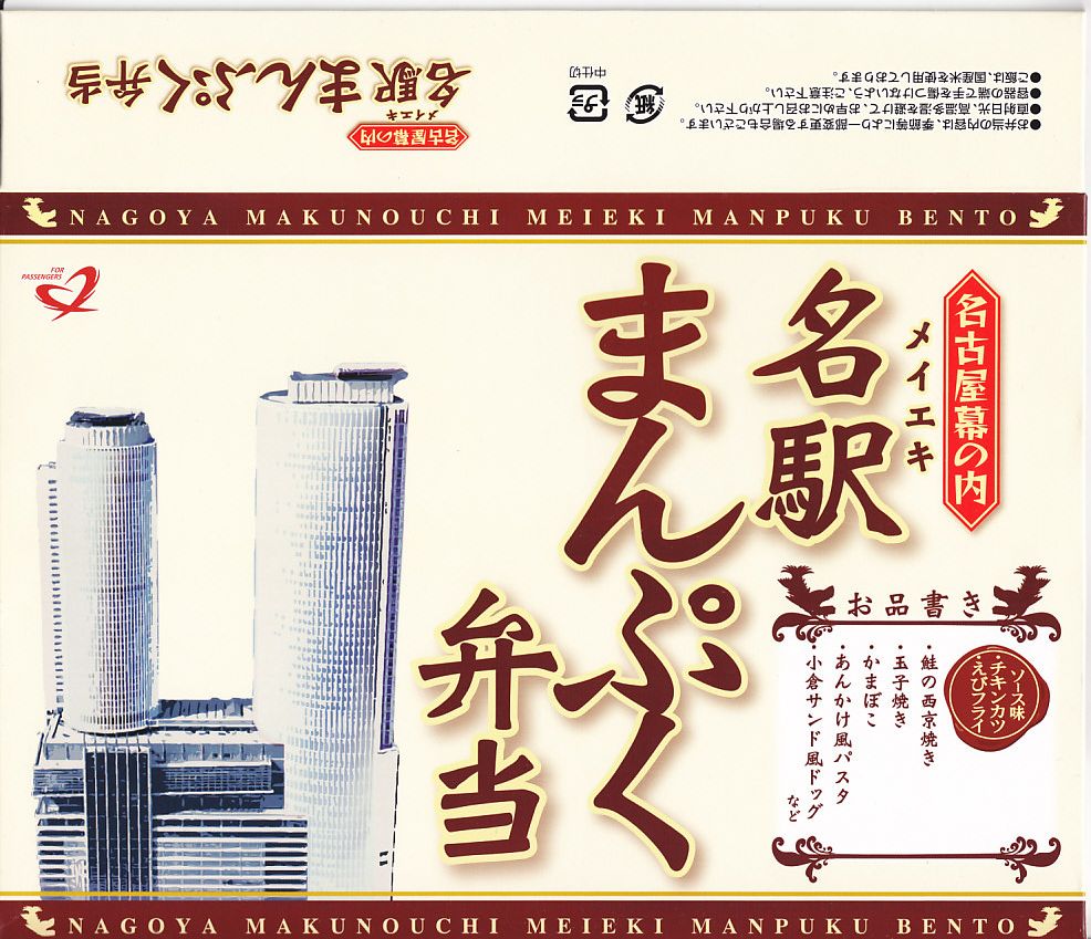 名古屋駅の幕の内弁当の、JRCP版。広重「東海道五十三次」鳴海の絵を描いた紙箱に黒いトレーを入れて、食品表示のシールで封をする。中身は幕の内駅弁なので俵飯に各種のおかずという構成なのだが、そのおかずが骨付鶏、さざえ壺焼、エビフライ、鰻蒲焼とけっこう豪華でデザートにういろうも付いており、それでいて大都市駅の幕の内駅弁なのに千円を切る価格が付けられている。2004年頃までの販売か。