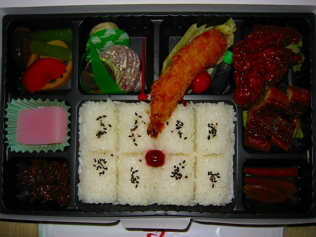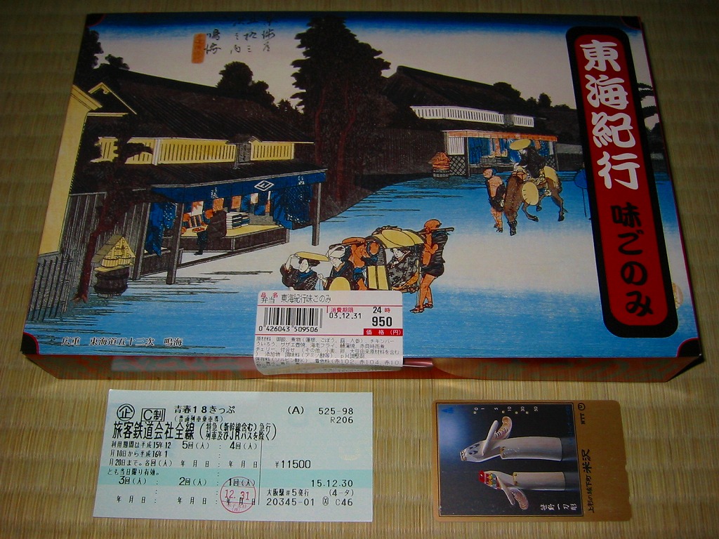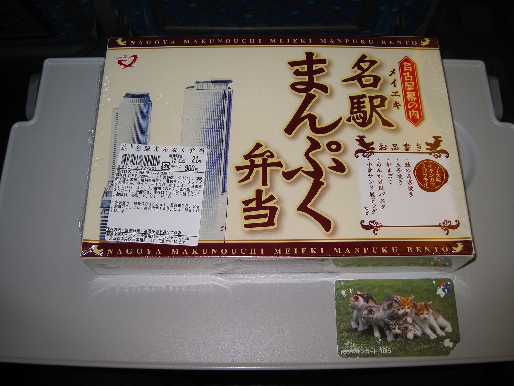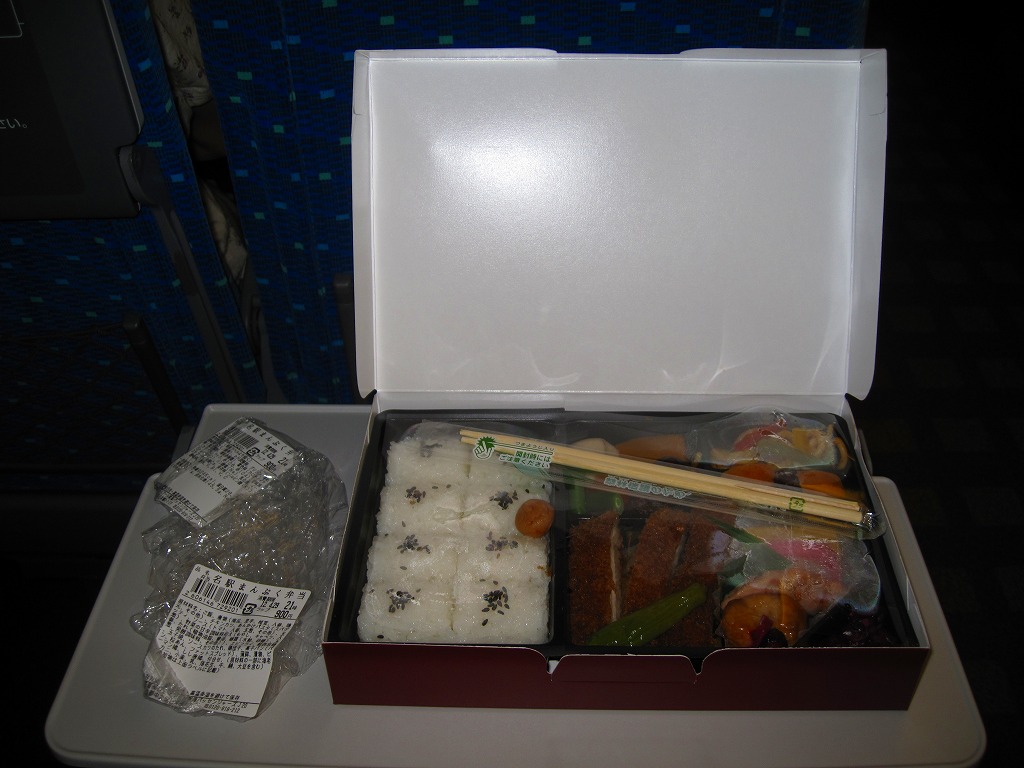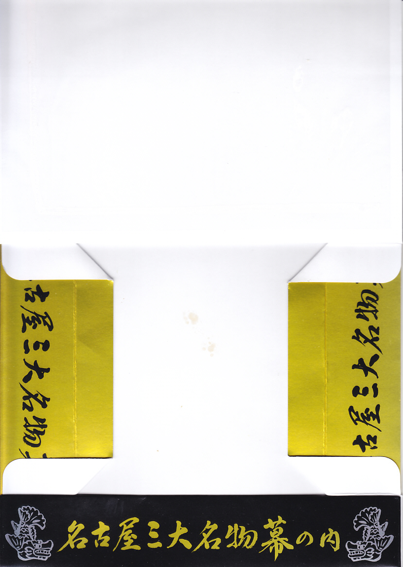 名古屋駅の幕の内弁当の、JRCP版。広重「東海道五十三次」鳴海の絵を描いた紙箱に黒いトレーを入れて、食品表示のシールで封をする。中身は幕の内駅弁なので俵飯に各種のおかずという構成なのだが、そのおかずが骨付鶏、さざえ壺焼、エビフライ、鰻蒲焼とけっこう豪華でデザートにういろうも付いており、それでいて大都市駅の幕の内駅弁なのに千円を切る価格が付けられている。2004年頃までの販売か。