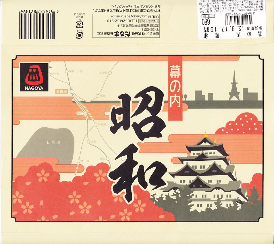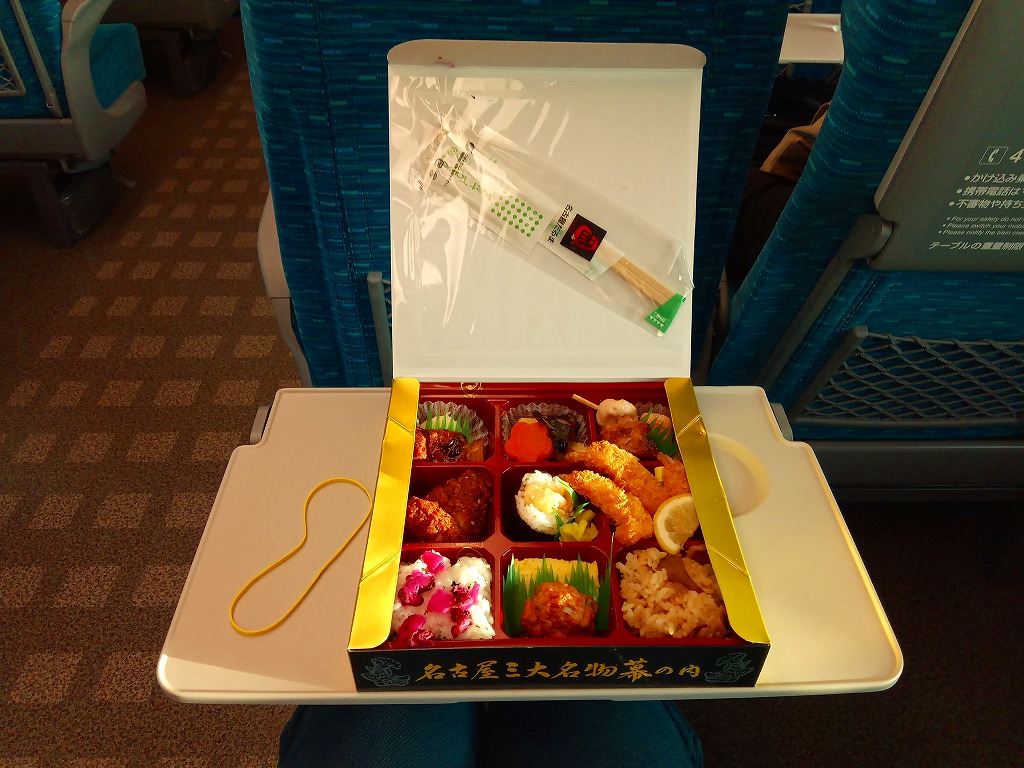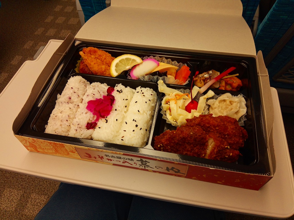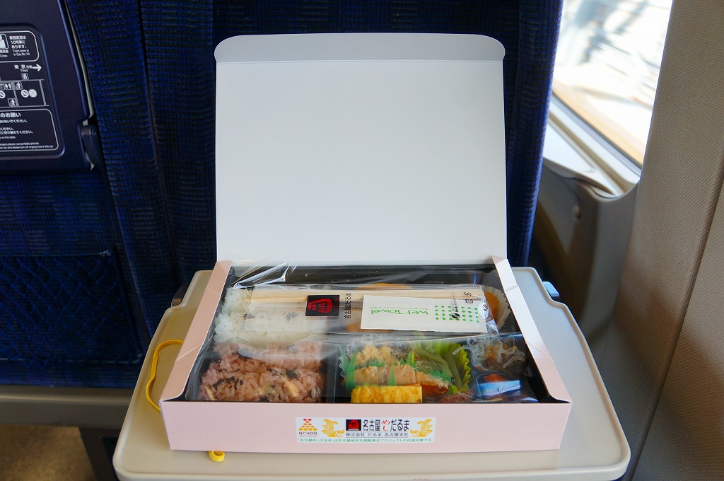 2008(平成20)年の発売か。路線を省略する度合いが不思議な鉄道路線図と、名古屋城やテレビ塔などを描いたボール紙のパッケージを使用。黒いプラ製トレーに収めた中身は、日の丸俵飯、サケ焼とかまぼこと玉子焼、白身魚フライ、しゅうまい、焼き鳥、牛しぐれ煮、ちくわ天、金時豆など。中身はその内容も姿も分量も、幕の内駅弁の定番と基本を押さえながら、少しだけ愛知県してる。価格は2012年の購入時で680円、2015年時点で756円、2016年時点で700円、2023年時点で750円。2023年までの販売か。