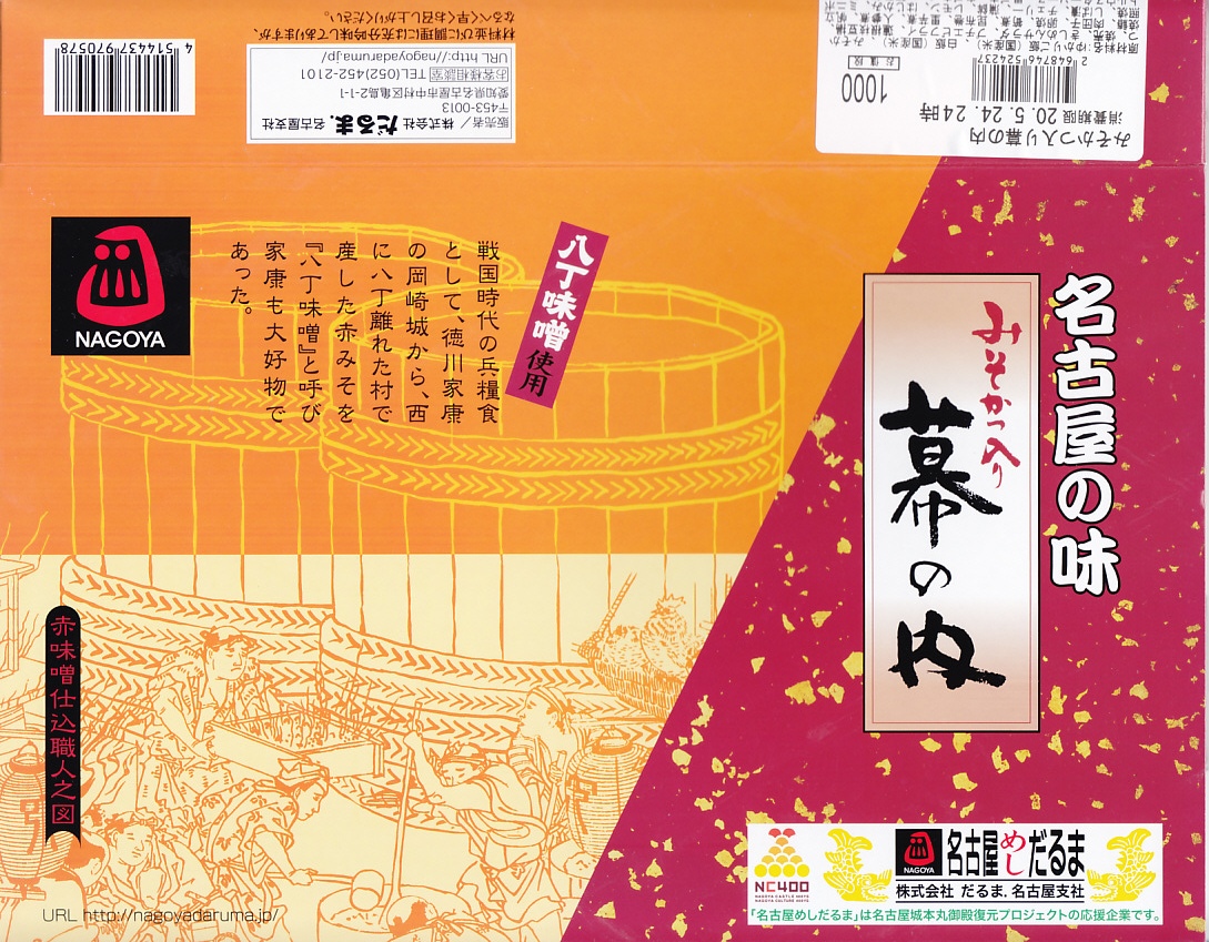 2000(平成12)年の前後に発売か、それ以前からの販売か。八丁味噌のように赤みがかる専用紙箱には、味噌の仕込み風景や宣伝文を書いている。中身はゆかりご飯と白飯の俵飯に柴漬けを載せ、みそかつ2枚、焼売、きしめんサラダ、エビフライと肉団子、タケノコなどの煮物とかまぼこと玉子焼、サワラ焼と蓮根枝豆揚、はじかみとさくらんぼを詰めるもの。名古屋や味噌の味を詰めた、幕の内タイプの駅弁。