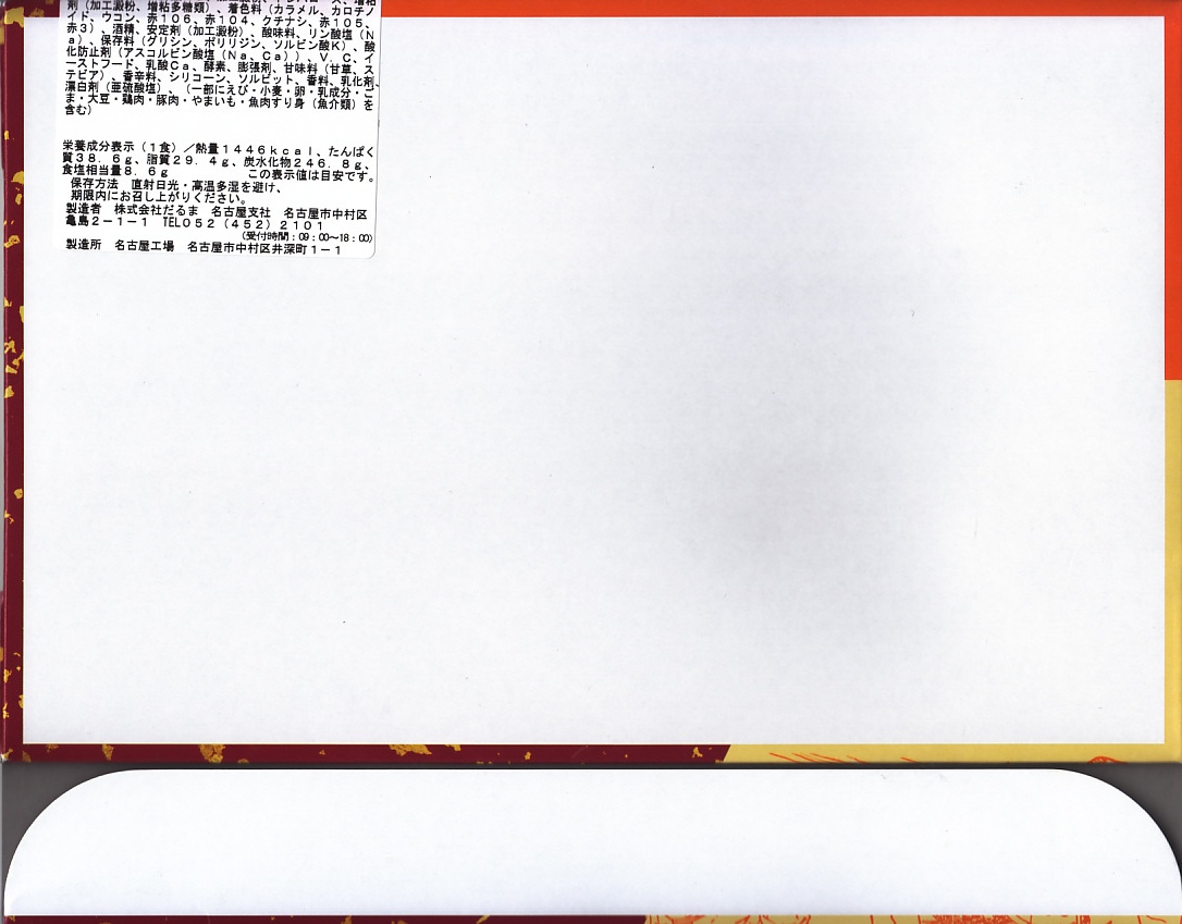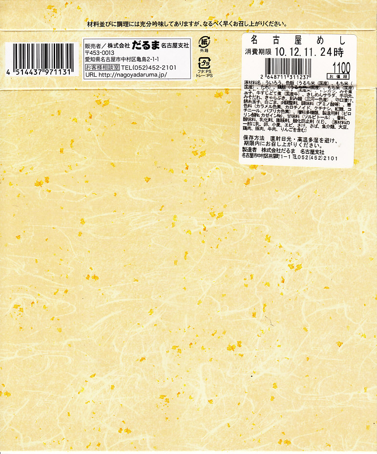 2014(平成26)年にナゴヤドームのお弁当として発売か。駅での販売は翌2015(平成27)年からか。幕の内弁当らしくなく9区画に仕切る中身は、金色に輝く専用紙箱に書かれた「みそかつ」「天むす」「えびふらい」ときしめんサラダに、きのこ御飯、わかめ御飯とはりはり漬、とんてきとポテトサラダ、昆布やタケノコなどの煮物、玉子焼と蓮根枝豆揚、練り物の串と照り焼きチキン。内容でも幕の内っぽさが皆無な、とても賑やかな駅弁。価格は2020年の購入時で1,200円、2024年時点で1,300円。だるまの名古屋駅弁は、2024年9月頃にJR名古屋駅での販売を終了か。