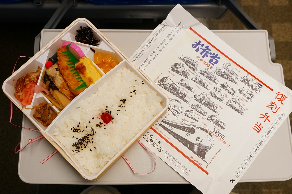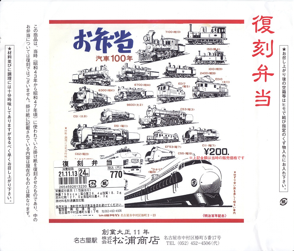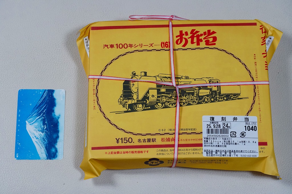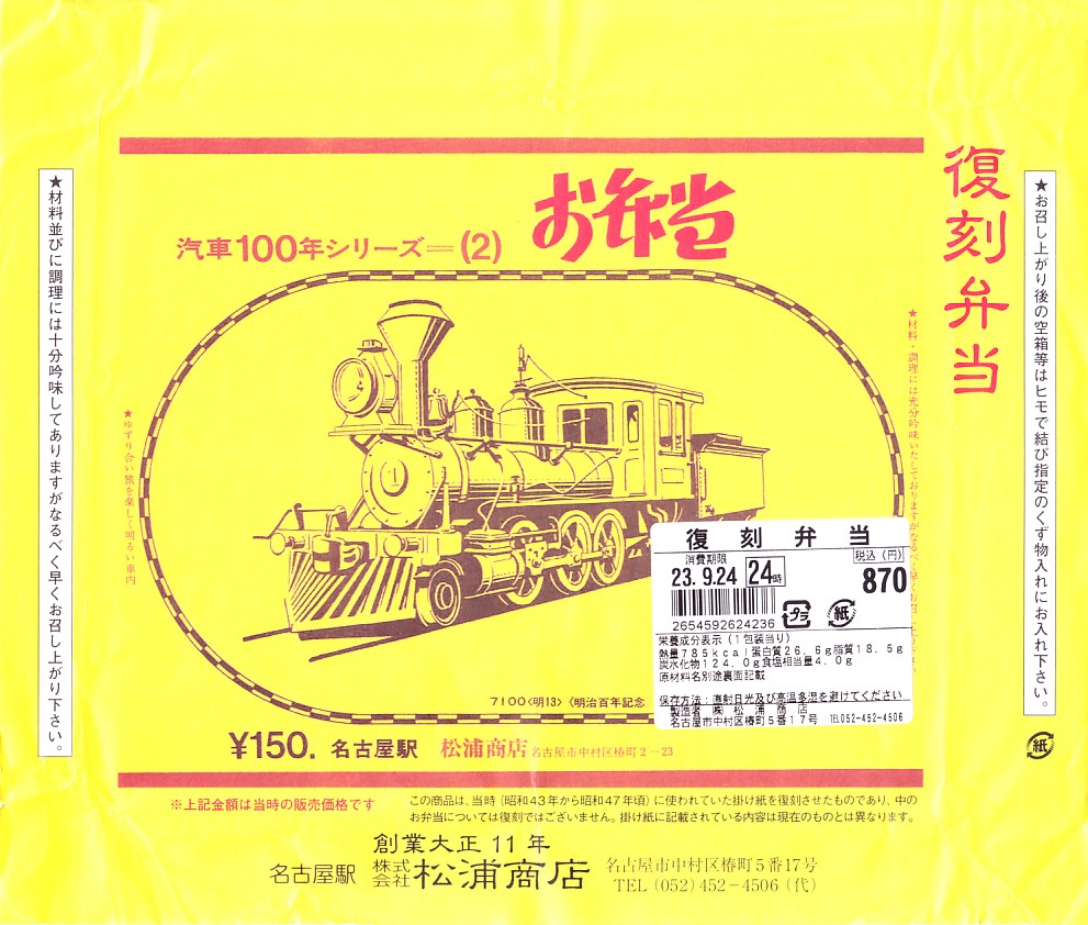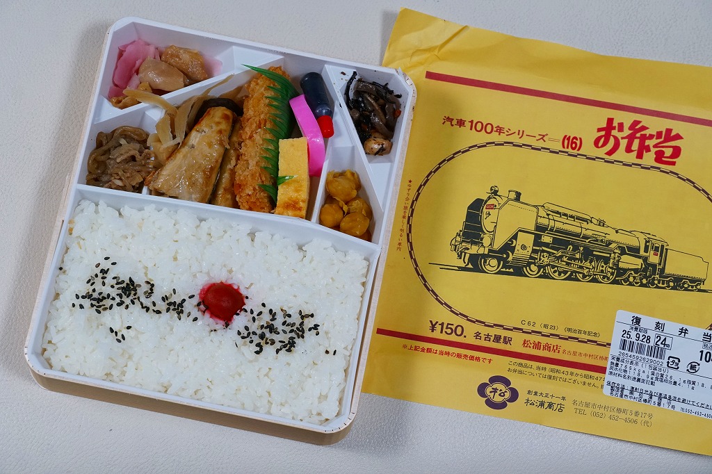2007(平成19)年9月に、名古屋駅の新幹線改札外にあった駅弁実演販売コーナーで発売。掛紙は昔の名古屋駅弁のものを使用、発売時は「大正11年創業当時の掛紙」「昭和の御大典の掛紙」「時刻改正の掛紙」「国際観光年(1967年)の掛紙」を日替わりで使用した。2017年頃から、1972年の名古屋駅弁で使われた汽車100年シリーズの掛紙20種類のうちどれかが使われる模様。今回はその16番目の、国有鉄道C62形式蒸気機関車のバージョンで売られていた。