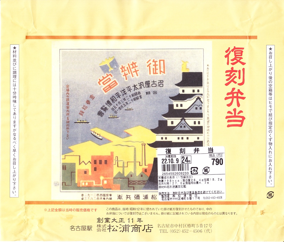 2022(令和4)年10月9日に購入した、名古屋駅弁の掛紙。今回はいつもと異なり、日本鉄道構内営業中央会の鉄道開業150年記念復刻駅弁企画により、同月から期間限定で販売された31社34駅弁のひとつとして、10月1日から31日まで各地で販売した。キャンペーンのミニクリアファイルを添付。1937(昭和12)年の駅弁掛紙の絵柄を取り入れたそうで、同年の3月15日から5月31日まで名古屋で開催された博覧会「名古屋汎太平洋平和博覧會」の文字に、工業地帯や飛行機に船舶、当時は本物だった名古屋城天守を描く。