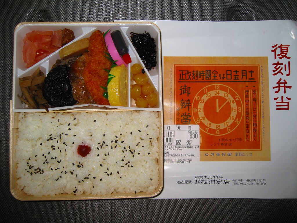 中身は昔懐かしい味の幕の内弁当だそうで、「復刻ではございません」という注記がある。名古屋駅で名物の幕の内駅弁「こだま」と同じ容器を、掛紙をかけて使う。中身は日の丸御飯に焼サバ、白身魚フライ、玉子焼、かまぼこ、牛肉炒め煮、シイタケやタケノコの煮物、栗豆、大根桜漬など。掛紙がどうであれ、安価なのにスキのない正統派の幕の内駅弁。価格は2007年の発売時や2010年時点で630円、2015年時点で660円、2017年時点で690円、2019年時点で750円、2019年8月から770円、2022年4月から790円、2023年時点で870円、2024年時点で970円、2025年時点で990円、9月の購入時で1,040円、12月時点で1,090円。