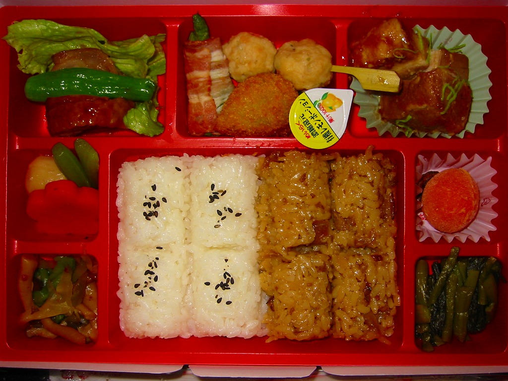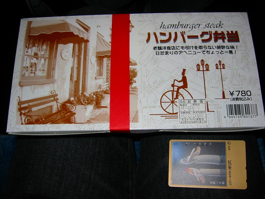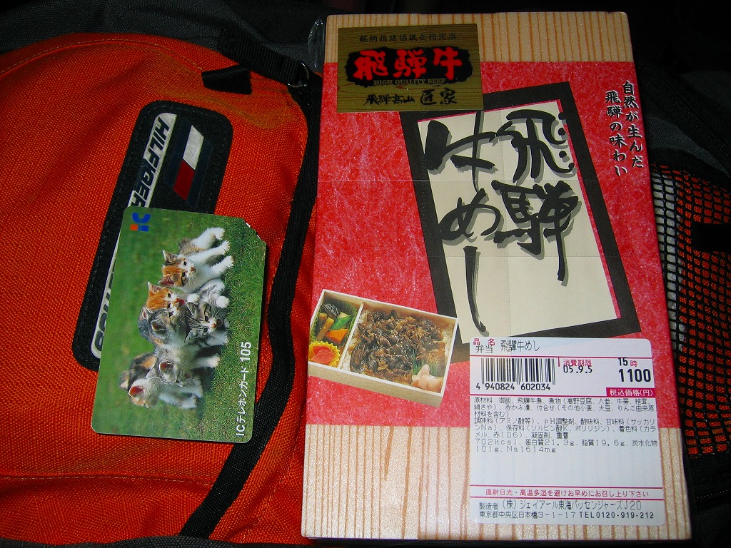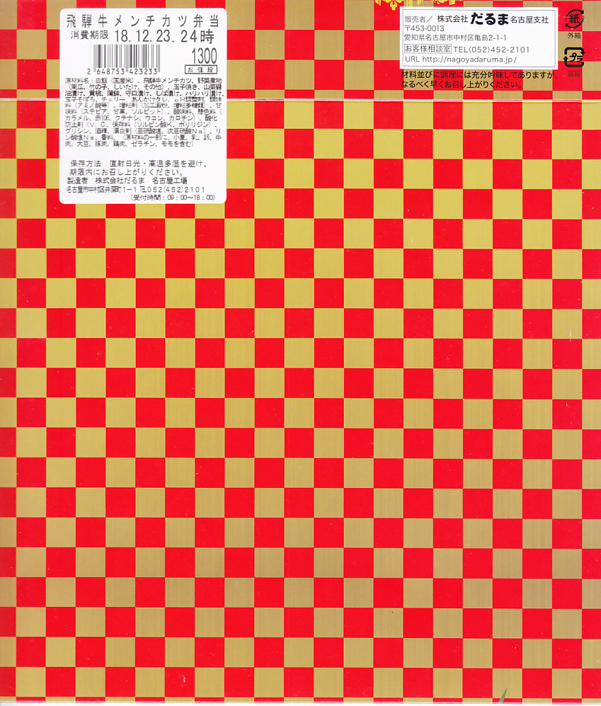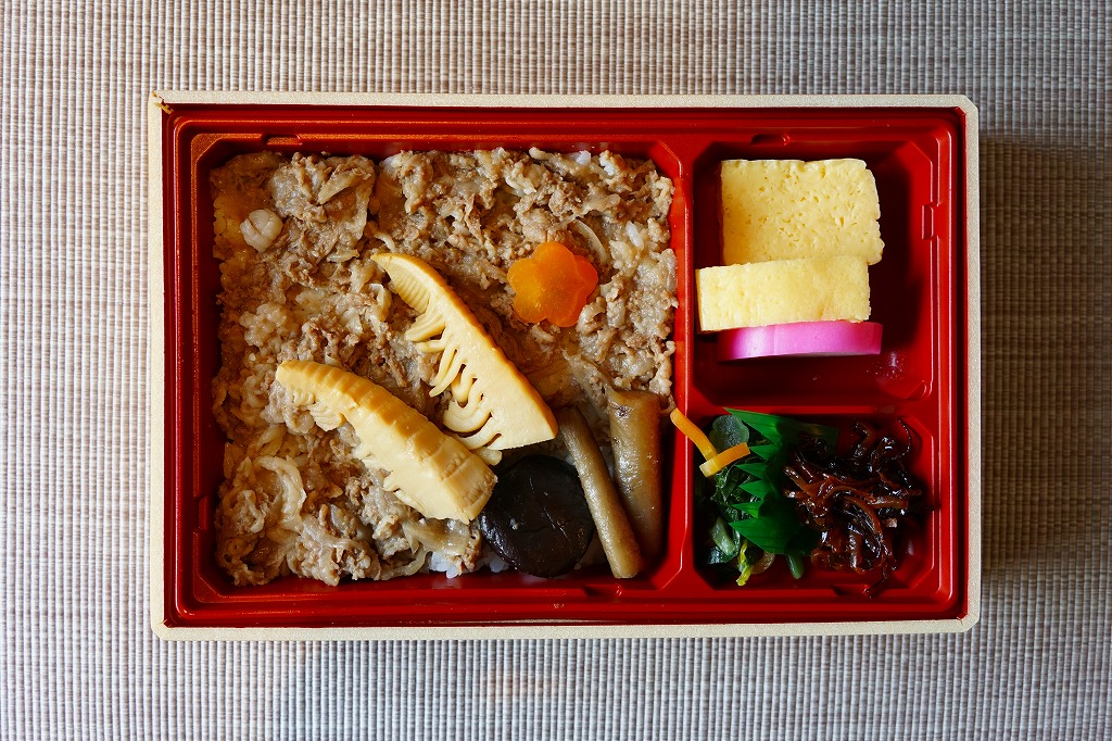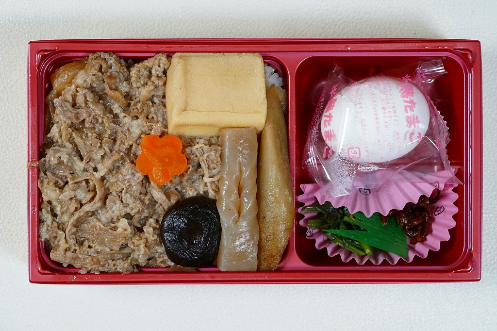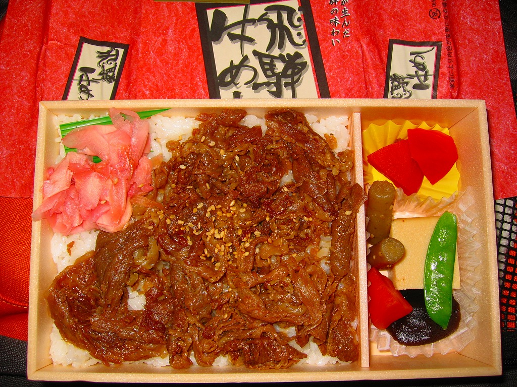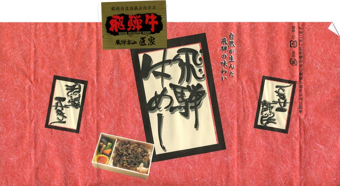 2004(平成16)年までに発売か。長方形の容器に赤い掛紙を巻いて、食品表示ラベルを貼りプラ帯で留める。中身は白御飯に飛騨牛すき焼き肉を載せ、赤かぶ漬や数点の煮物を添える。