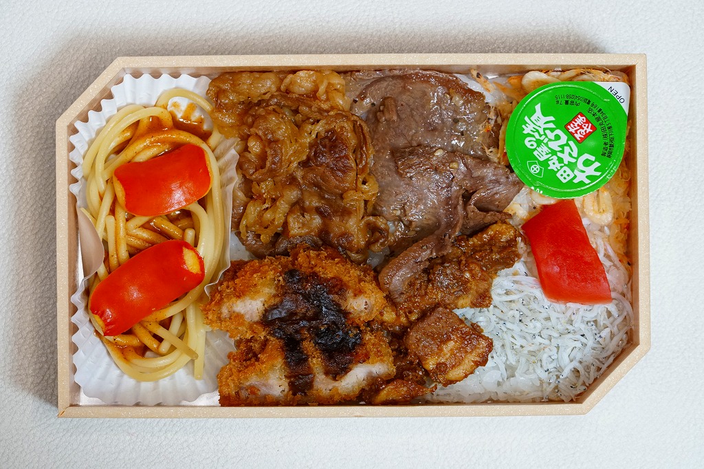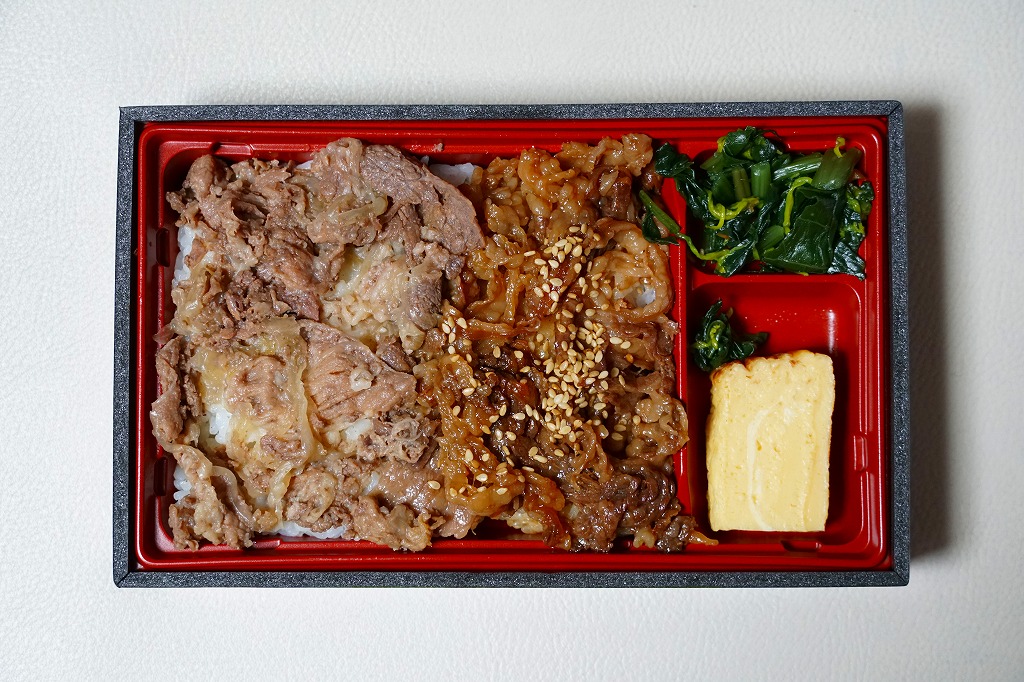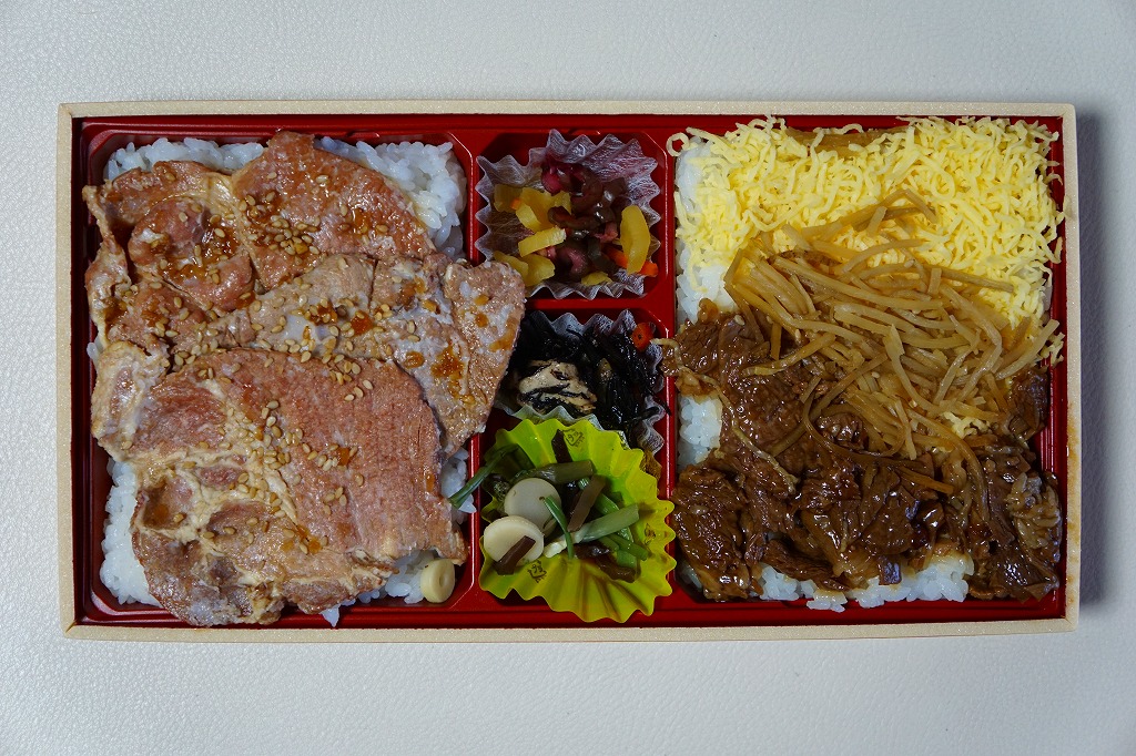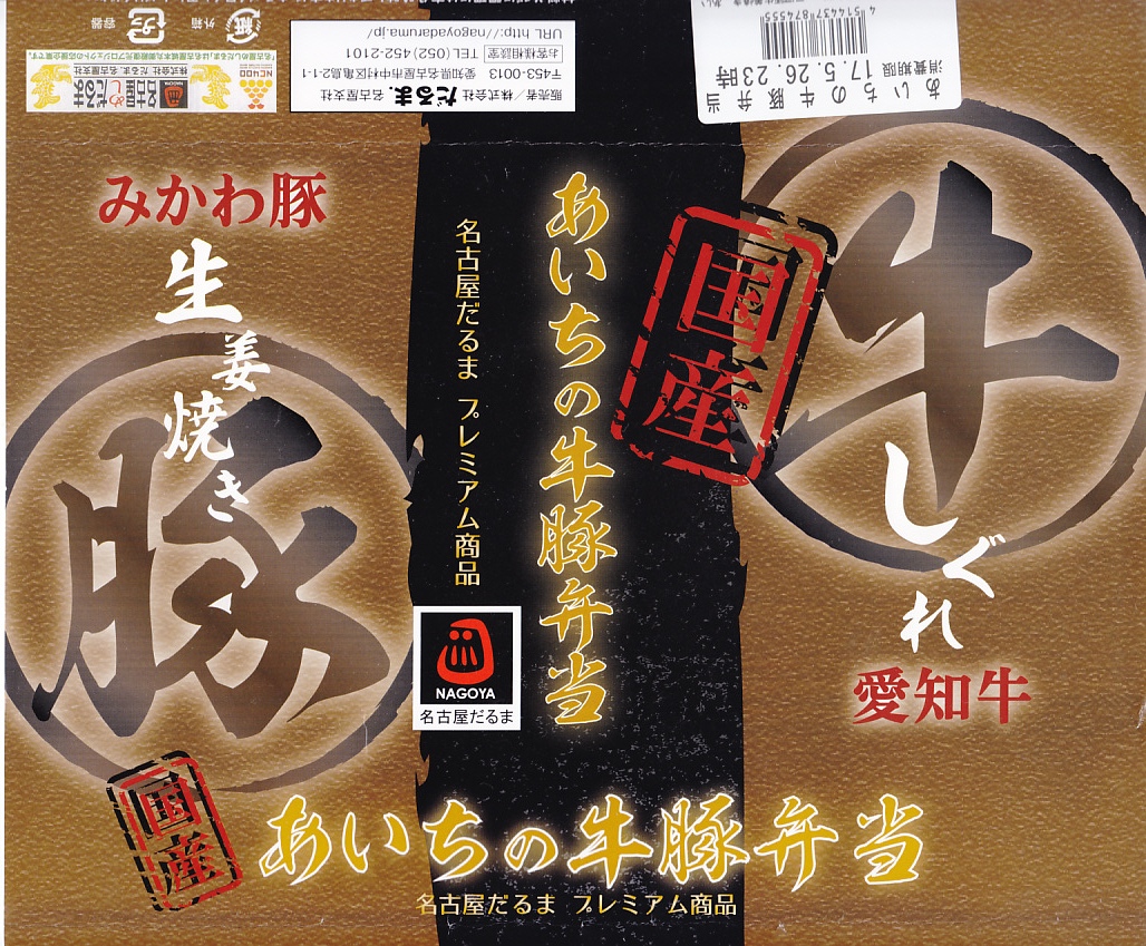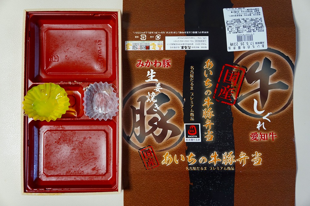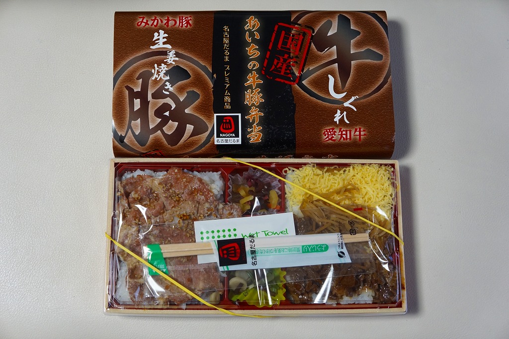 2015(平成27)年9月12〜24日にナゴヤドームのプロ野球中日ドラゴンズ戦で販売。以後は限定的かつ断続的に、スーパーの駅弁大会や名古屋駅で売られる模様。長方形の容器の右側で、白飯を愛知牛しぐれ煮ときんぴらごぼうと錦糸卵で覆い、左側で白飯をみかわ豚生姜焼きで覆い、ひじき、山菜、漬物で仕切る。中身の見た目と味で、肉質の悪さと業務用冷凍食品の多用で、これはがっかり。2017年までの販売か。