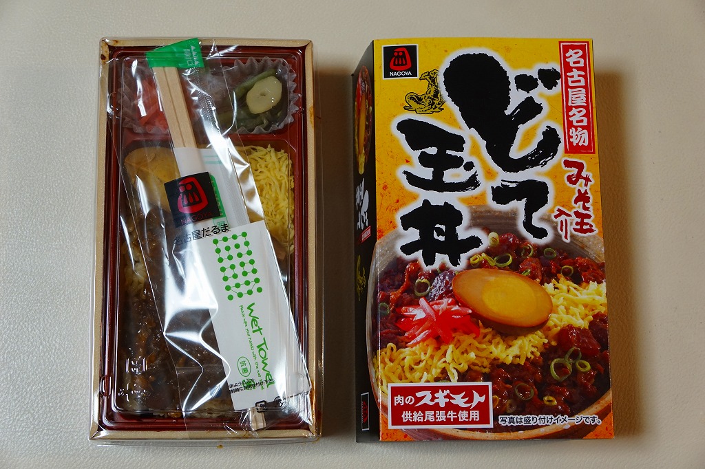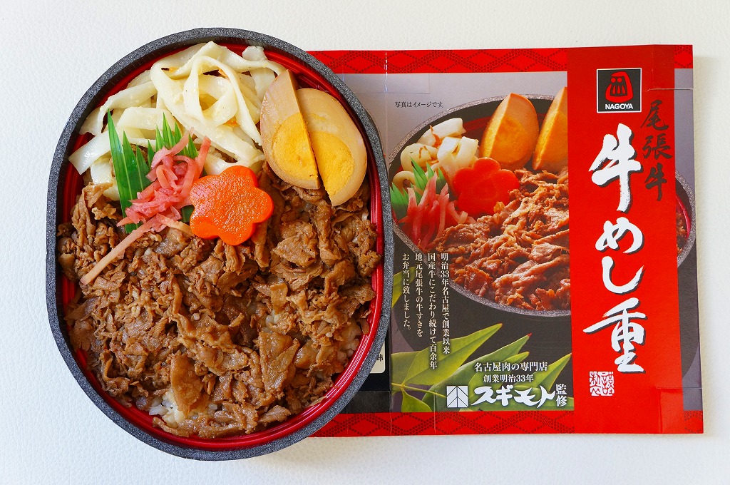 2013(平成25)年の秋から、主に東急ストアの駅弁大会で売られる、駅で売らない疑義駅弁。杉本食肉産業の「尾張牛」を使う牛丼。白御飯を牛しぐれ煮で覆い、煮玉子、ニンジン、紅生姜、きしめんサラダを添える。牛丼の部分は普通の味で、きしめんに名古屋を感じた。価格は2014年の購入時で880円、2017年時点で910円。どうもなぜか初秋に限り東京で売られる模様。2018〜2019年の駅弁大会シーズン限りで終売か。2020年時点で中部国際空港の空弁になっている模様。