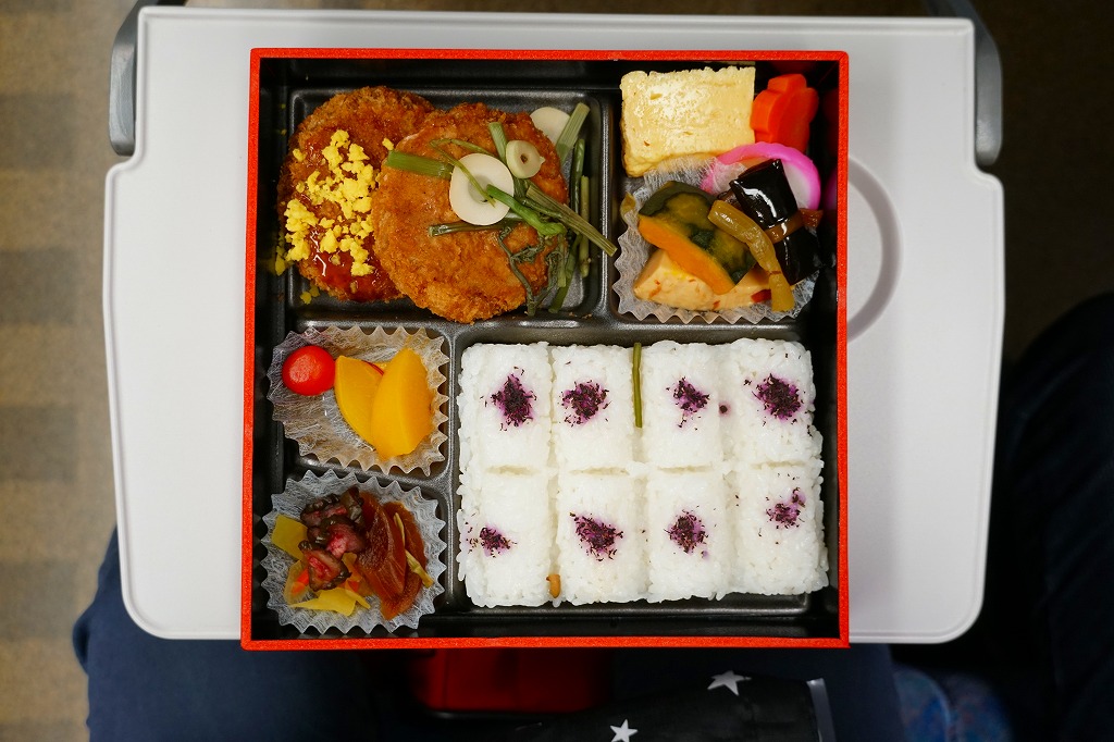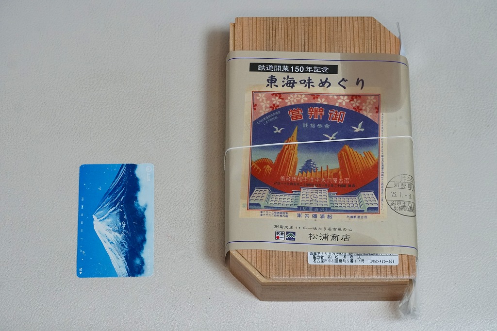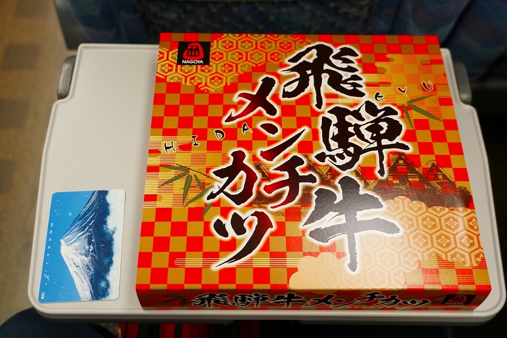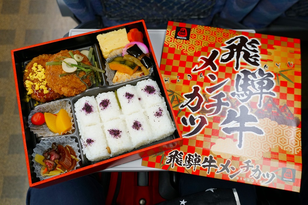 2017(平成29)年の発売か。名古屋駅弁らしい大きな容器に、飛騨牛のメンチカツ2枚、俵型の型押し飯、玉子焼、山菜、カボチャやタケノコなどの煮物、守口漬と柴漬けとハリハリ漬け、黄桃とチェリーを詰める。メインのメンチカツはまるで工業製品のように身が詰まり形が整い、白飯の型押しもプレス機械の製品のよう。冷蔵での販売であり、品質でなく味わいの点では疑問を感じた。2019年頃までの販売か。