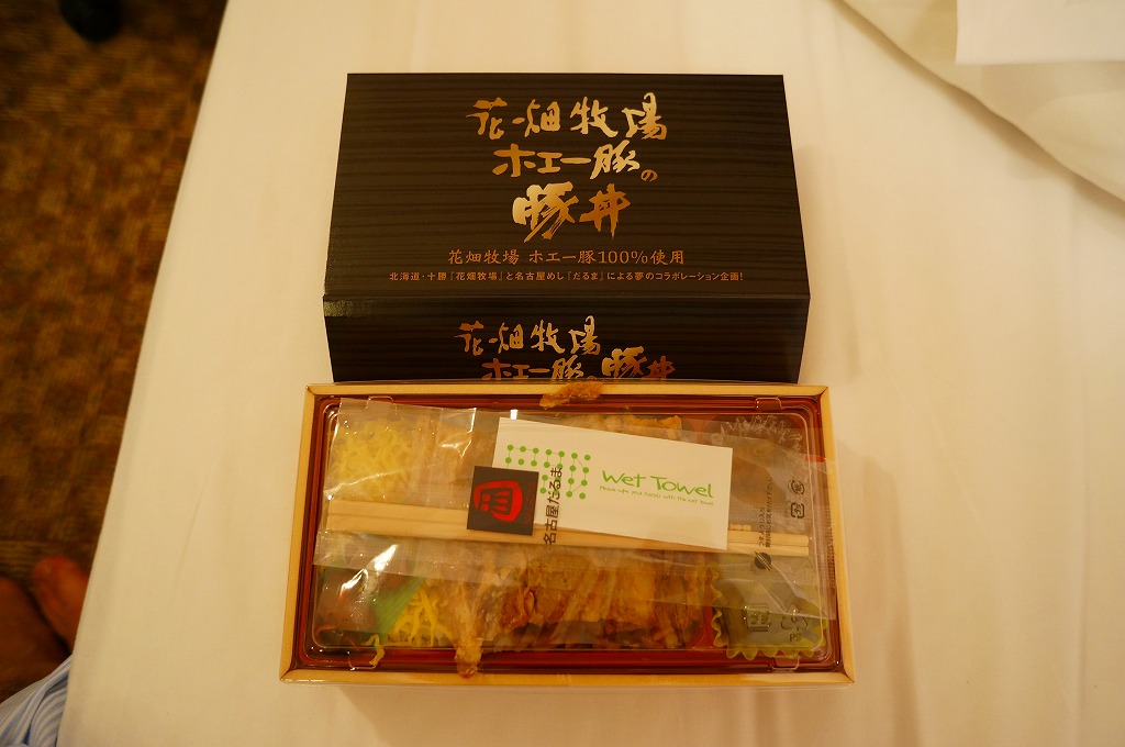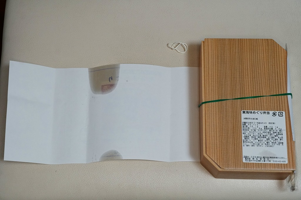 掛紙には1937(昭和12)年の名古屋汎太平洋平和博覧会の記念掛紙の絵柄を取り込んだ。名古屋駅の幕の内駅弁より小柄な容器に白飯を詰め、しらす、桜えび、豚ステーキ、みそカツ、松阪牛焼肉、飛騨牛焼肉で覆い、スパゲティとウインナーを添え、赤かぶらとわさび漬カップも入れる。東海地方の静岡県と岐阜県と愛知県の名物を盛り付けたという。肉が高価なのだろうが、それにしても高額な弁当。