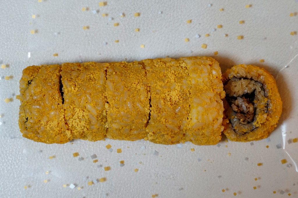2018(平成30)年7月に発売。松阪牛の焼肉を芯に、タレ御飯と海苔を二重に巻き、玉子そぼろをまとわせた細身の太巻きが1本、金銀のフィルムに巻かれて金色の紙容器に収められる。飯も肉も玉子も、なかなか甘い味付け。類例を思い当たらない不思議な商品に思えた。価格は2018年の発売時で1,000円、2020年の購入時で1,080円、2022年時点で1,100円、2023年時点で1,150円。2024年までの販売か。