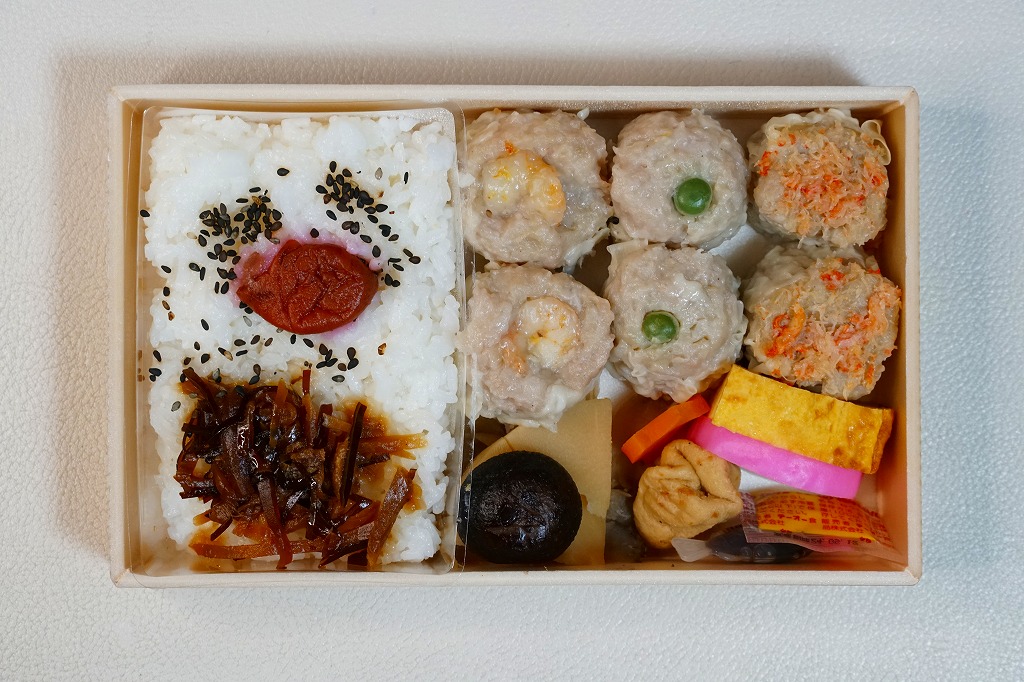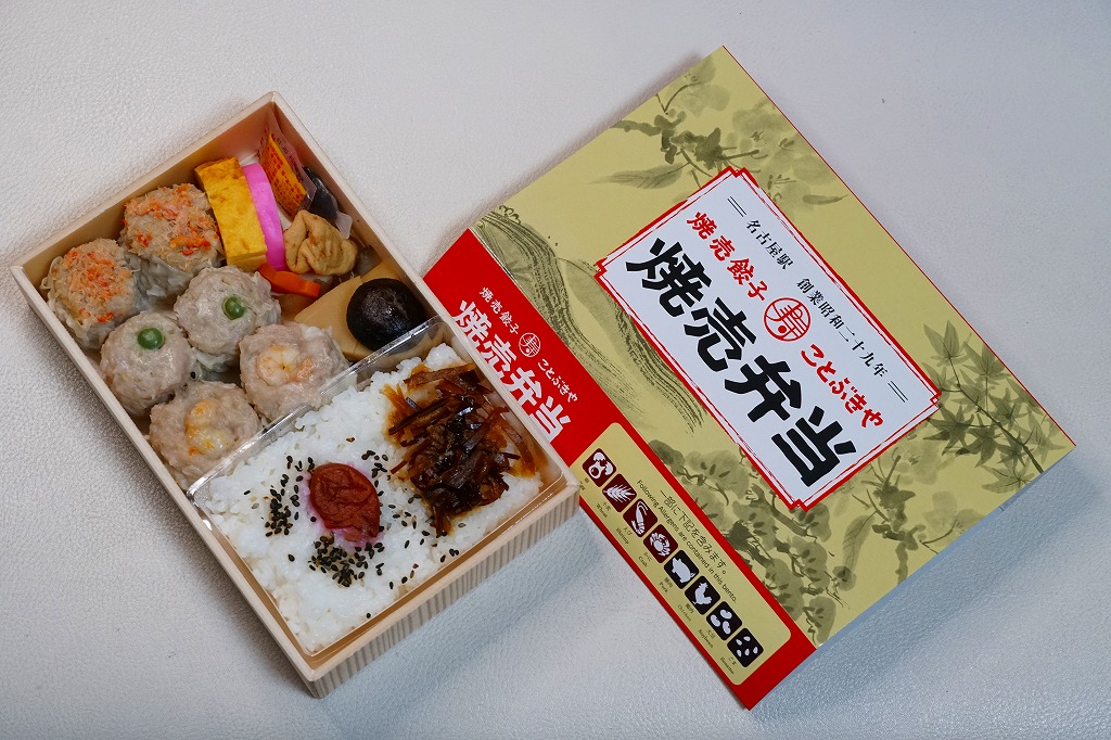 2020(令和2)年12月に名古屋駅で発売。1954年に名古屋で創業し、名古屋駅前の百貨店で焼売や餃子を販売した寿屋を名乗る焼売弁当。同社が2019年に名古屋駅弁の松浦商店の子会社へ事業譲渡されたことで、この弁当が名古屋駅に誕生したという。長方形の容器に、生姜昆布を載せた日の丸御飯を詰め、惣菜としては通常サイズ、駅弁としては大きめなえび焼売、焼売、かに焼売を2個ずつ入れ、かまぼこ、玉子焼、煮物、醤油と辛子を添える。白い肉と皮の球に手作り感のある弾力があり、弁当の姿と内容を持ちながら焼売のみの惣菜を食べている感じ。この調子で餃子の弁当も見てみたい。2024年春頃までの販売か。