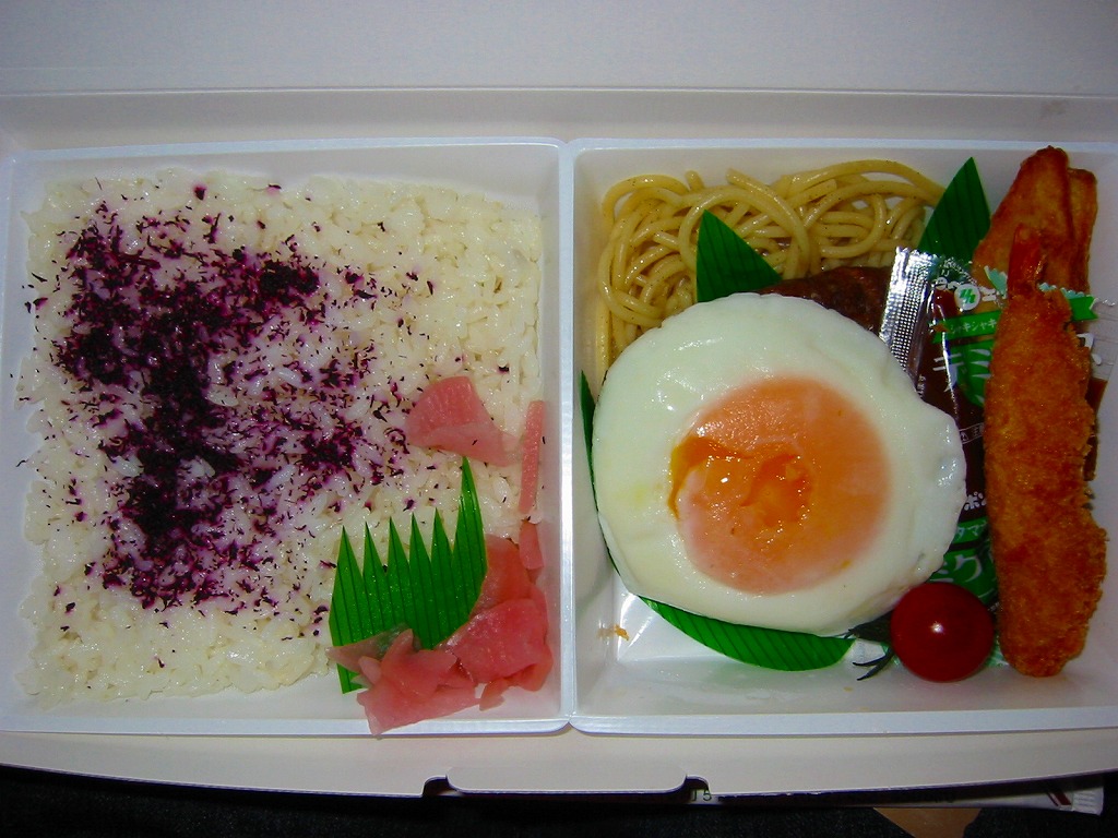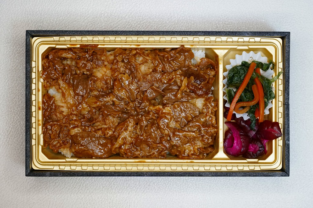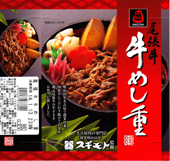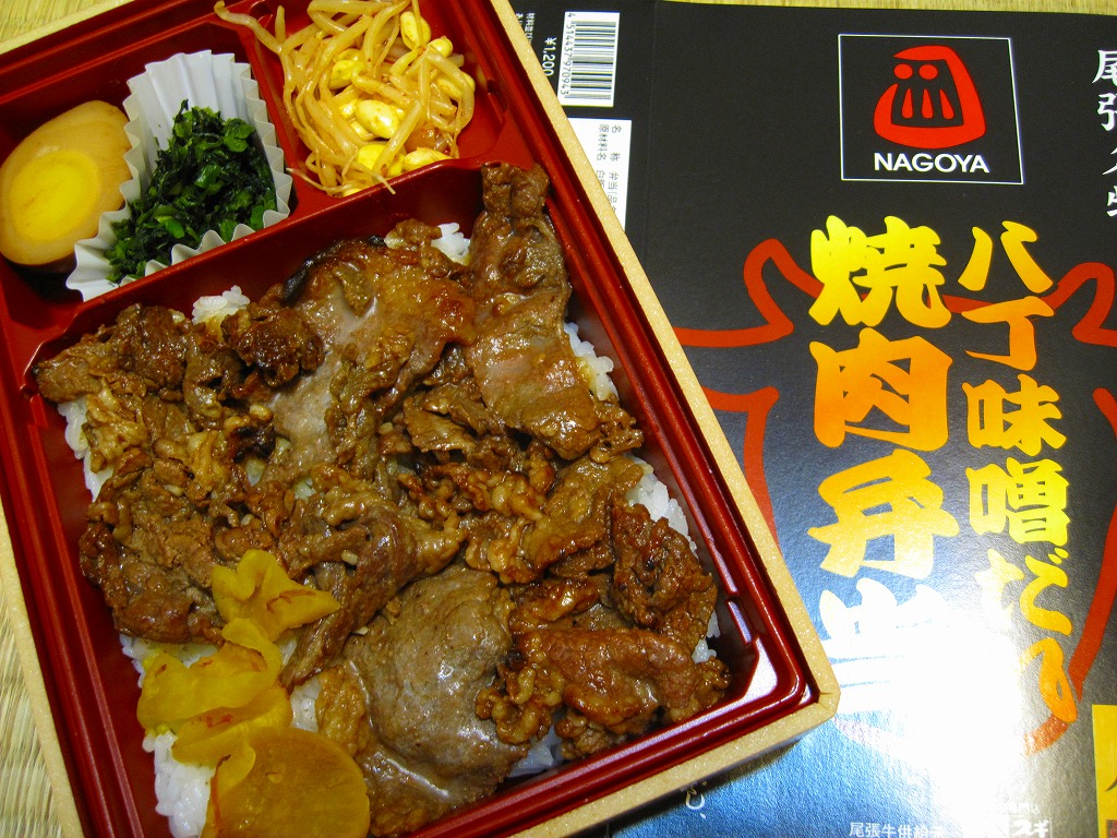 2006(平成18)年の春頃に発売か。ちょっと大きめな長方形の容器に透明なふたをして、商品名をしっかり書いた黒いボール紙の枠にはめる。中身は白御飯の上に味噌だれを絡めた尾張牛の焼肉を貼り付け、煮玉子半分、キムチもやし、青しそ高菜、つぼ漬けを添えるもの。2011年頃までの販売か。