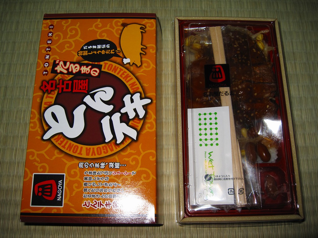 2009(平成21)年の秋までに発売か。長方形の容器に透明なふたをして、商品名を書いたボール紙の枠にはめる。中身は白御飯の上にもやし炒めを敷き、「とんテキ」なる豚焼肉を載せて、落花生煮と春雨酢の物を添えるもの。味噌カツだらけの名古屋駅弁の中で、珍しい醤油系のたれをまとう豚肉駅弁。固く歯応えのある豚肉も、全国各地で柔らかさを競う昨今としては珍しい感じ。価格は2010年の購入時で780円、2014年4月の消費税率改定で800円。2015年までの販売か。