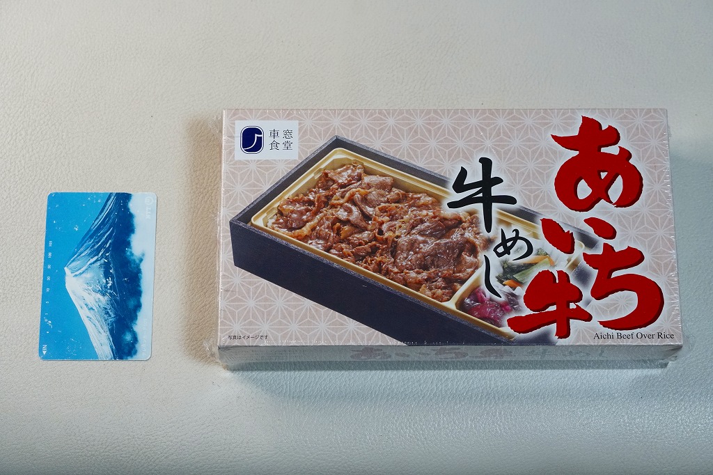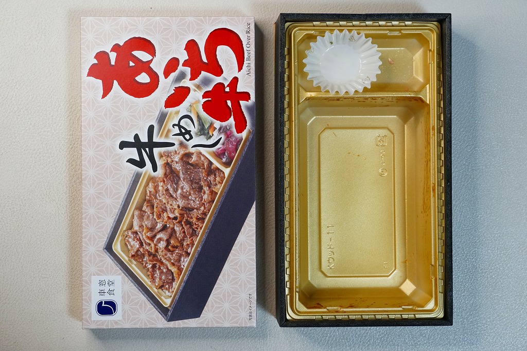 2017(平成29)年11月に名古屋駅で発売。長方形のプラ容器に白飯を詰め、牛肉煮で覆い、青菜としば漬けを添える、日本全国の牛肉駅弁に共通のつくり。タレの多さが個性か。醤油ベースで煮込んだ、やわらかな肉質の愛知県産「あいち牛」を使うそうな。価格は2017年の発売時で1,100円、2022年時点で1,140円、2023年時点で1,200円、9月の購入時で1,250円、2025年時点で1,450円。