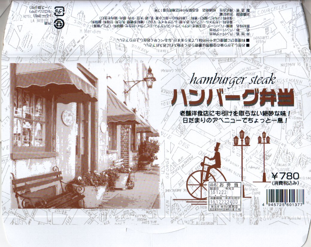 ホカ弁やコンビニではありふれているが、駅弁ではなかなかお目にかかれないハンバーグ弁当の名古屋版。洋風建築と海外風地図をセピア色で印刷した白い紙箱を真っ赤な帯で締める。中身はしそ御飯に目玉焼、スパゲディ、エビフライ、ポテトフライとハンバーグ。