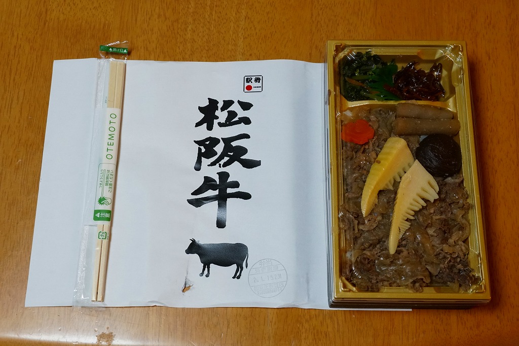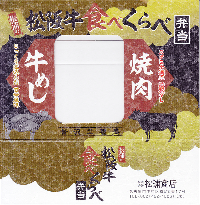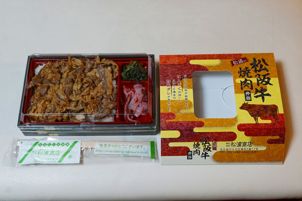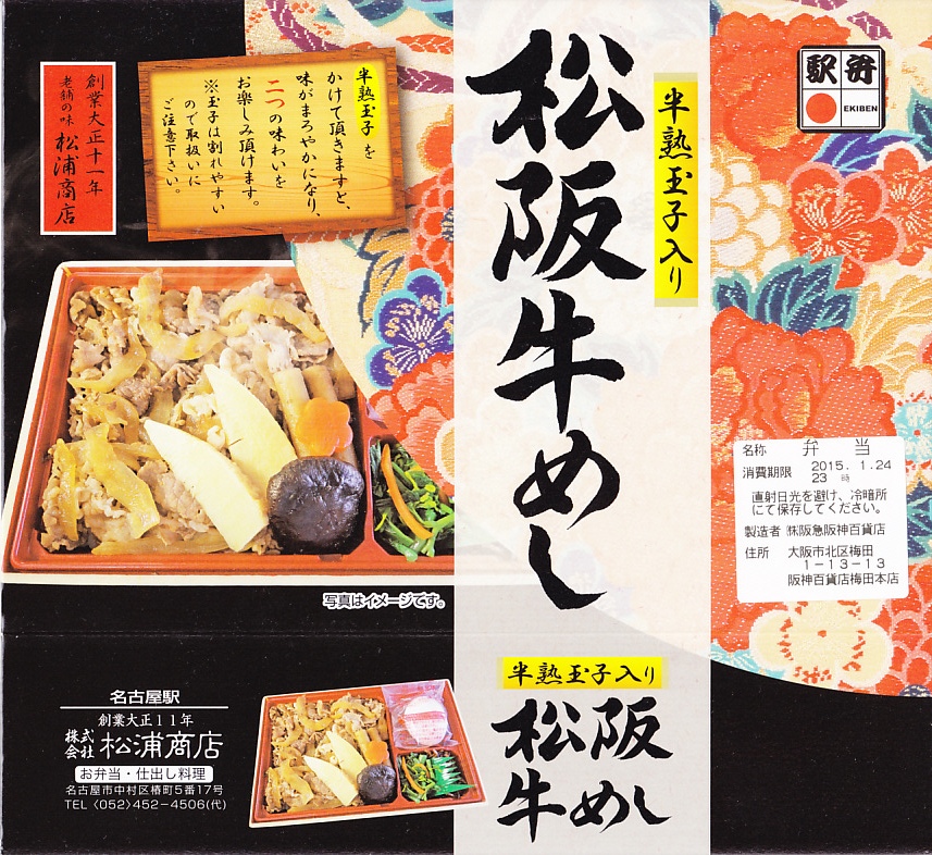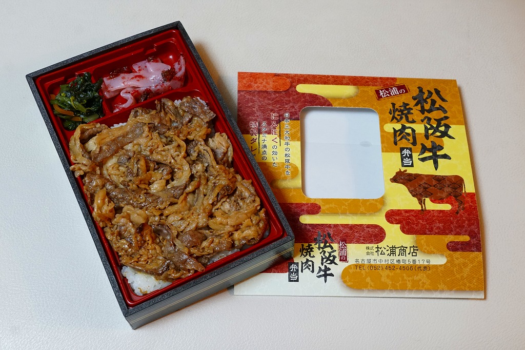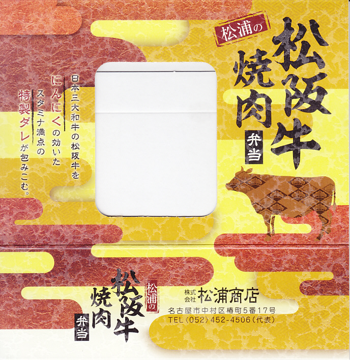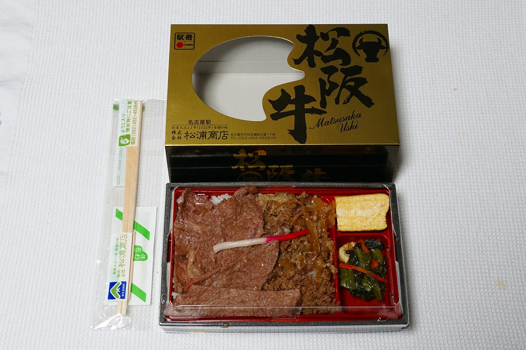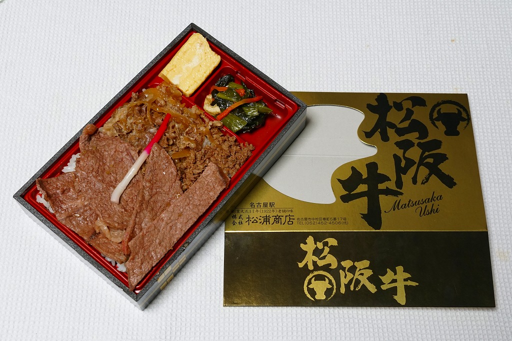 2012(平成24)年の秋までに発売。白御飯を牛肉煮で薄く覆い、タケノコとシイタケとゴボウとニンジンの煮物で彩り、玉子焼、かまぼこ、生姜昆布、わさび菜おひたしを添える。本来は玉子焼でなく半熟卵が入るようで、駅弁大会への輸送対応でこうなったのだろう。そんな輸送販売の影響か、少量の牛肉の脂が白く固くなり飯に浸み、ブランド牛の味がどこかに行ってしまっていた。なぜ名古屋駅で松阪牛なのかという疑問を感じさせながら、JR名古屋駅と近鉄名古屋駅での販売が続く。価格は2012年の発売時や2015年の購入時で1,100円、2016年時点で1,200円、2018年時点で1,250円、2019年8月から1,280円、2021年時点で1,340円、2022年時点で1,390円、2023年時点で1,480円。2024年秋頃までの販売か。