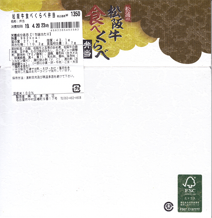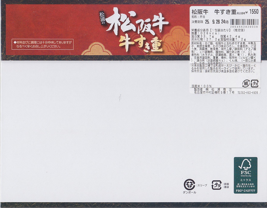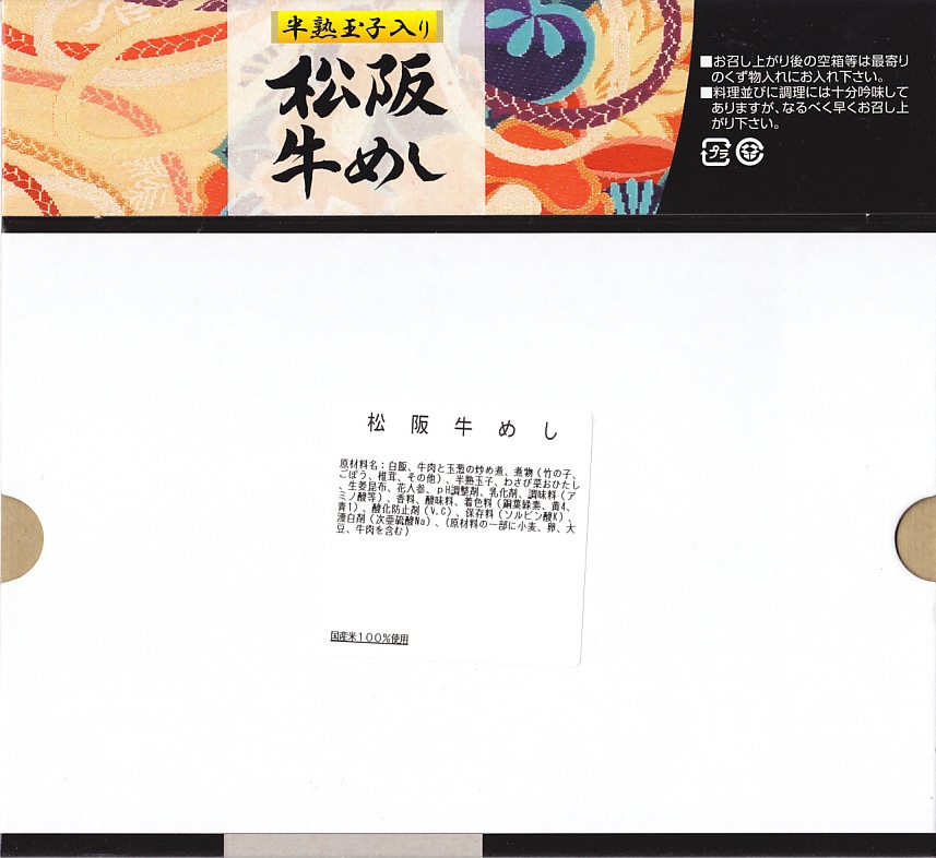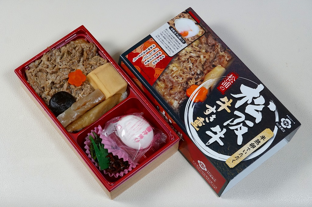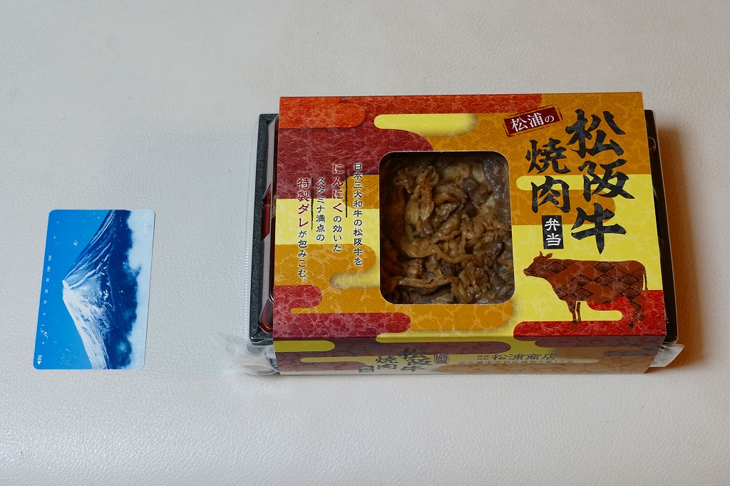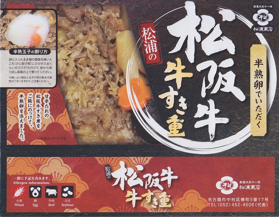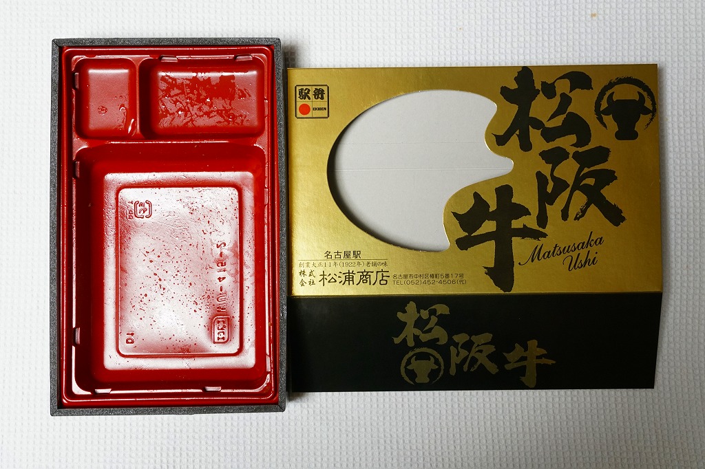 2012(平成24)年の秋までに発売。白御飯を牛肉煮で薄く覆い、タケノコとシイタケとゴボウとニンジンの煮物で彩り、玉子焼、かまぼこ、生姜昆布、わさび菜おひたしを添える。本来は玉子焼でなく半熟卵が入るようで、駅弁大会への輸送対応でこうなったのだろう。そんな輸送販売の影響か、少量の牛肉の脂が白く固くなり飯に浸み、ブランド牛の味がどこかに行ってしまっていた。なぜ名古屋駅で松阪牛なのかという疑問を感じさせながら、JR名古屋駅と近鉄名古屋駅での販売が続く。価格は2012年の発売時や2015年の購入時で1,100円、2016年時点で1,200円、2018年時点で1,250円、2019年8月から1,280円、2021年時点で1,340円、2022年時点で1,390円、2023年時点で1,480円。2024年秋頃までの販売か。