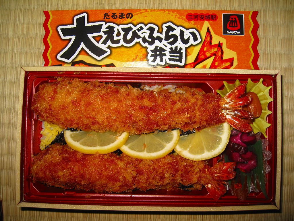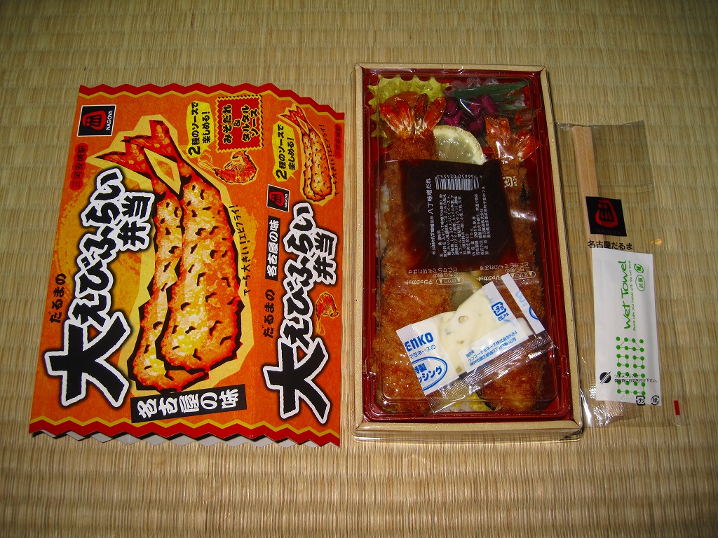 この年この月の京王百貨店の駅弁大会で実演販売したばかりの弁当が、早くもリニューアルか。下記「大えびふらい弁当」に比べて、中身が丼タイプから弁当タイプに変わり、えびふらい1本がみそカツに変わり、玉子焼にタケノコやサトイモなどの煮物やポテトサラダといった付合せが入り、価格が220円も下がった。現地ではどちらがちゃんと販売されているのだろうか。いずれもまだ、駅弁催事以外での目撃報告を探せていない。価格は2011年の購入時で880円、2014年時点で983円。現在はJR名古屋駅でなく、中部国際空港や近鉄名古屋駅で売られている模様。