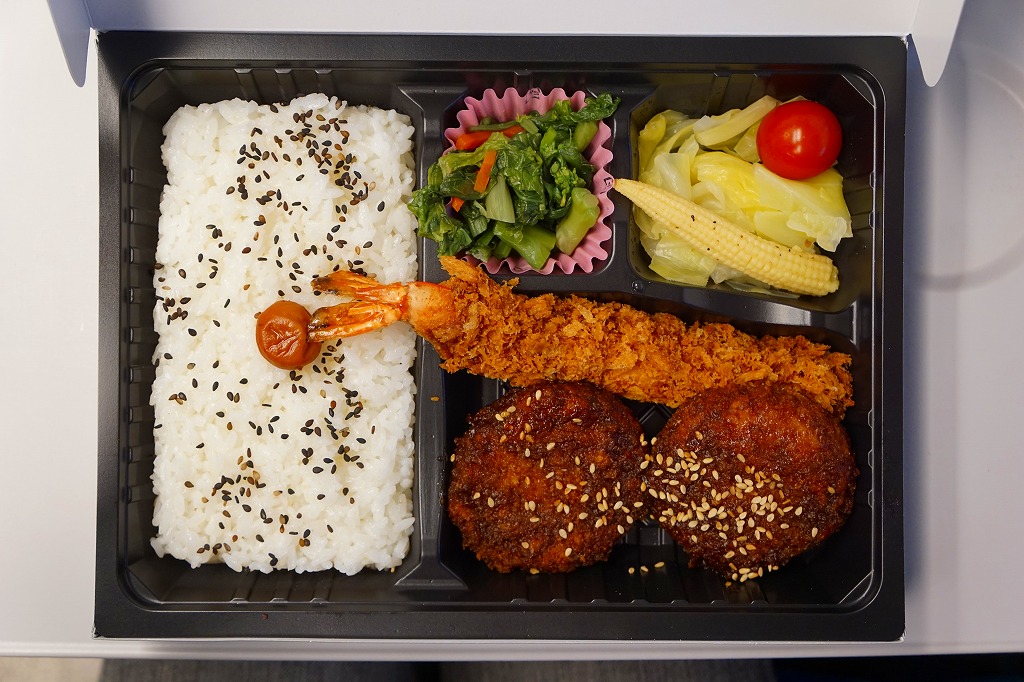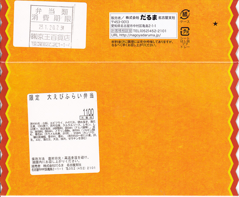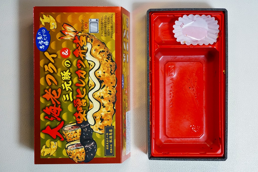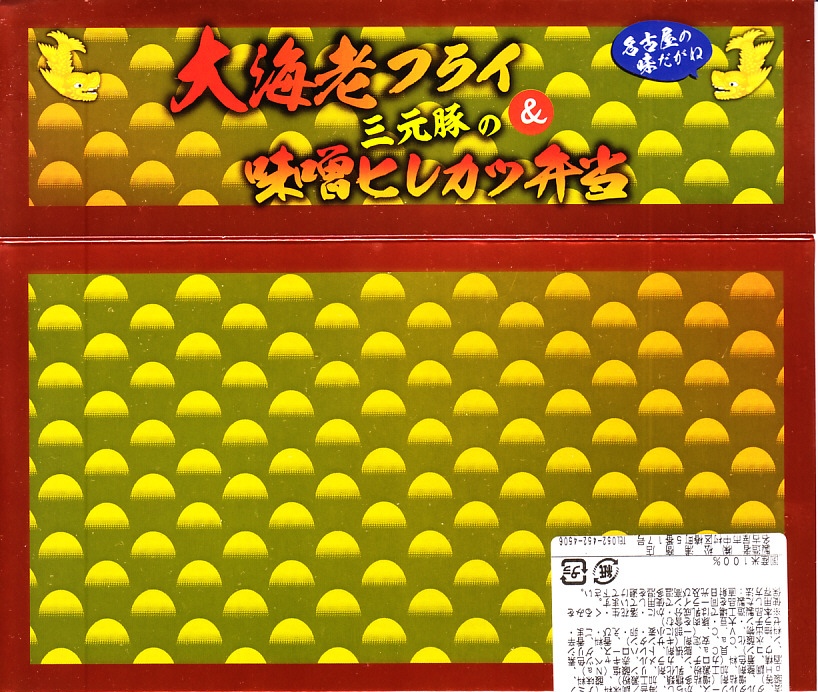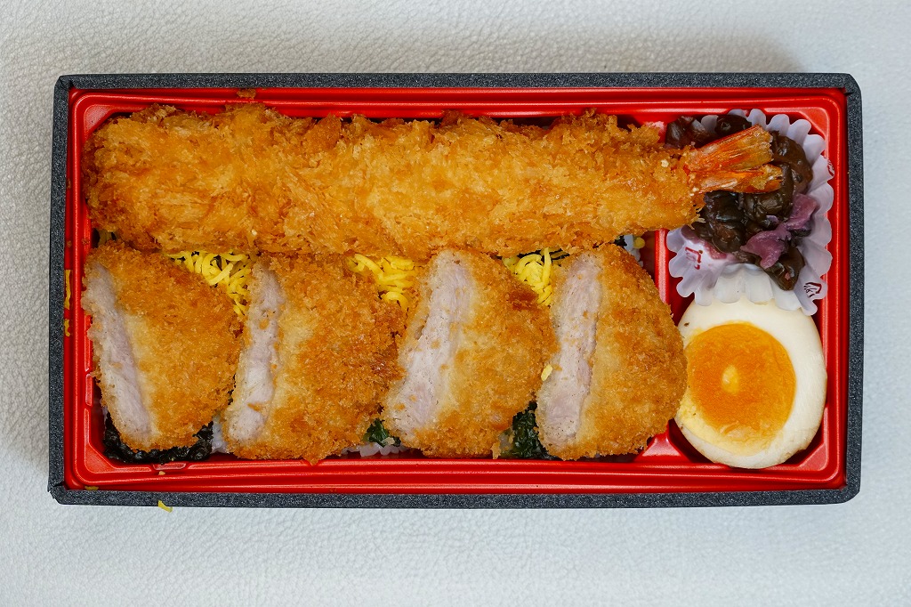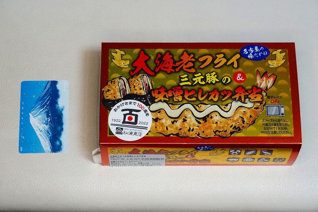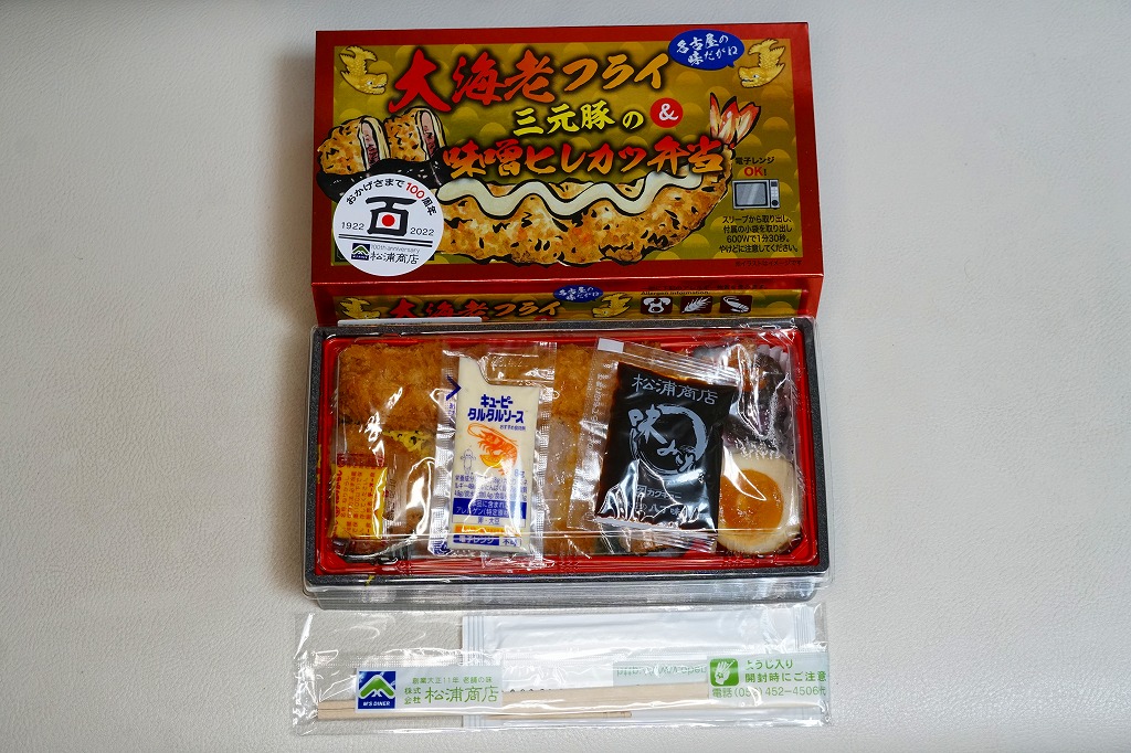 2021(令和3)年10月に東京都の京王百貨店の地下食品売り場で発売か。2022年に東京駅の駅弁売店「駅弁屋 祭」で売られたり、2023年1月の京王百貨店の駅弁大会で売られたり、収穫報告は東京ばかりで、名古屋駅で買えるか分からない。長方形のプラ容器に白飯を詰め、海苔と錦糸卵で覆い、エビフライと豚ヒレカツできれいに覆い、味付玉子と柴漬けを添え、味みそとタルタルソースの袋を添付。ど派手なスリーブも大えびふらいの内容も、名古屋駅ではこの松浦商店でなくだるまの駅弁のよう。調味料を使わずこのまま食べれば、意外に軽く爽やかな味。価格は2023年の購入時で1,200円、2025年の購入時で1,360円。