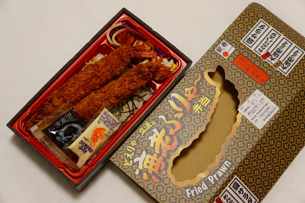 2011(平成23)年1月の京王百貨店の駅弁大会での実演販売で発売か。長方形の容器に透明なふたをして、駅弁の名前とエビフライを大きく書いたボール紙の枠にはめる。中身は御飯の上に錦糸卵と刻み海苔を敷き、確かに大きなエビフライを2本横たえて、レモンのスライス、落花生煮、昆布佃煮、守口漬を添えるもの。八丁味噌だれとタルタルソースを袋で別添する。