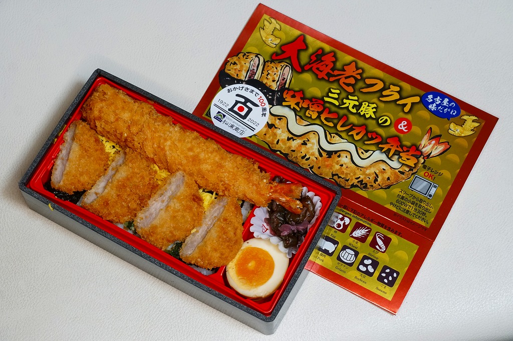 上記の駅弁「大海老フライ&三元豚の味噌ヒレカツ弁当」の、2023年時点での姿。上記の2025年のものと変わらない。スリーブに調製元100周年を記念するシールが貼られた。