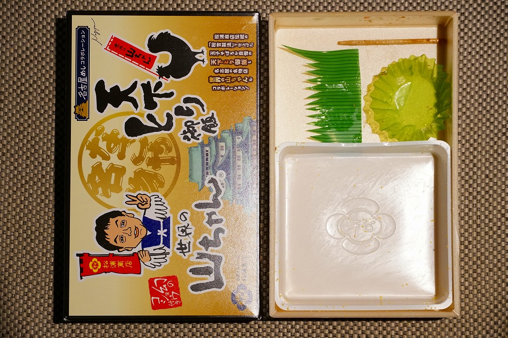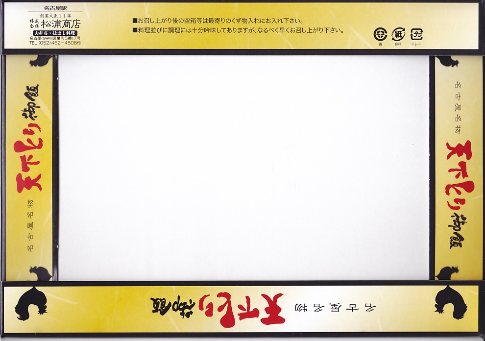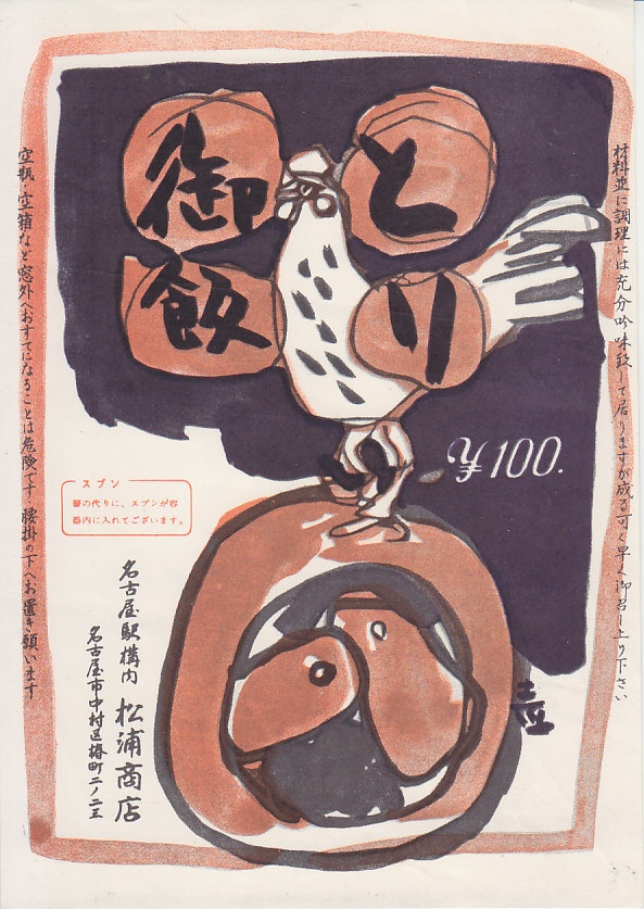 1960年代のものと思われる、昔の名古屋駅弁の掛紙。絵柄は下記のものと同じように見えて、なんだか違う。「箸の代りに、スプンが容器内に入れてございます」とあり、当時はまだ食器のスプーンの名が定着していなかったのだろうか。
