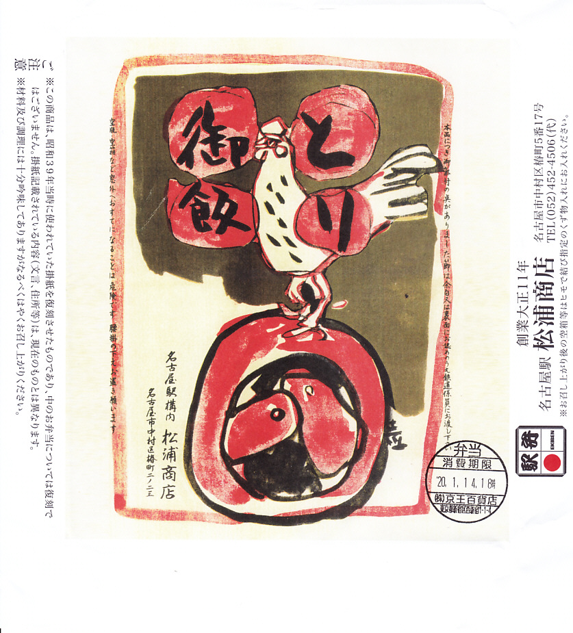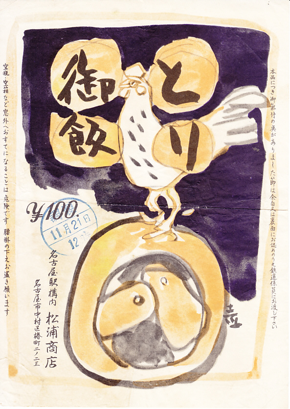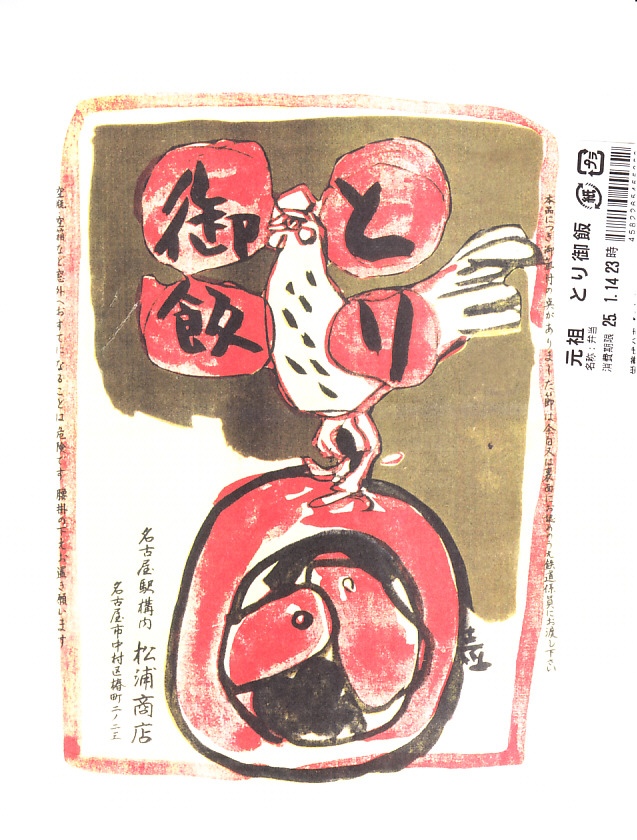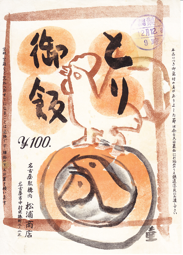 1960年代、昭和35年前後の、12月12日9時の調製と思われる、昔の名古屋駅弁の掛紙。下記の掛紙「とり御飯」と、描かれる内容は同じで、色合いが異なる。ニワトリの羽か尾は、こちらのほうが立派か。