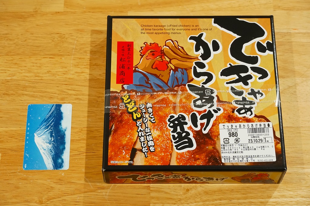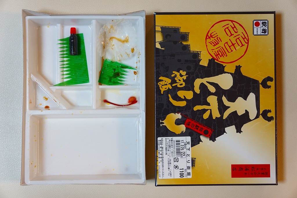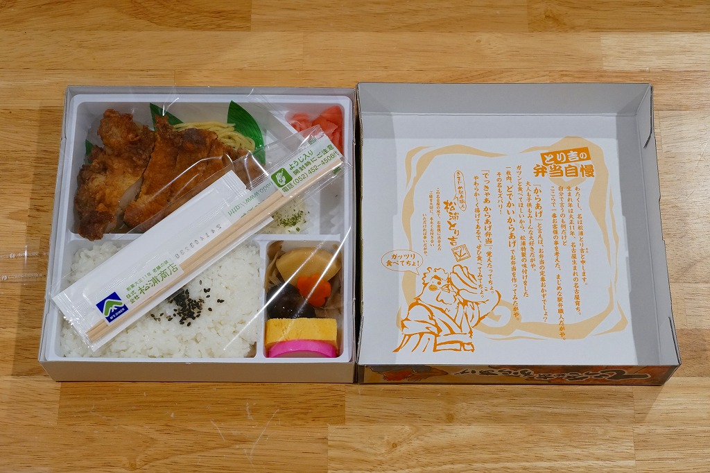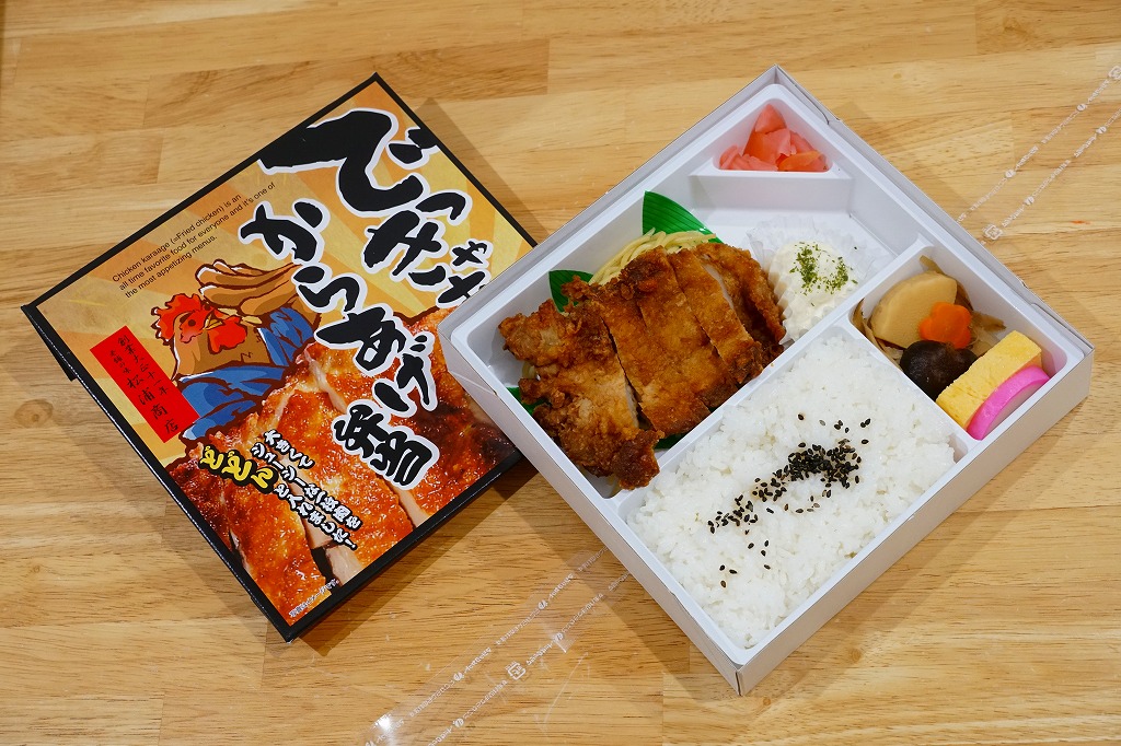 2004(平成16)年の新作駅弁か。暖かい色彩と質感を持つ正方形のボール紙容器を赤い紙帯で締める。中身は俵飯に鶏唐揚その他が入るシンプルな内容。通常は鶏肉を切ってから揚げる唐揚を揚げてから切る製法で、見た目でも香りでも味でも鳥の存在感がより強く出ており、これで750円とはお買い得。2012年頃に「でかから弁当」へリニューアルか。