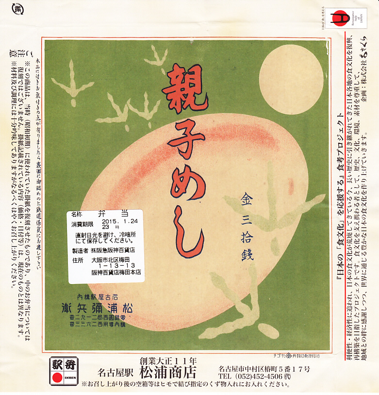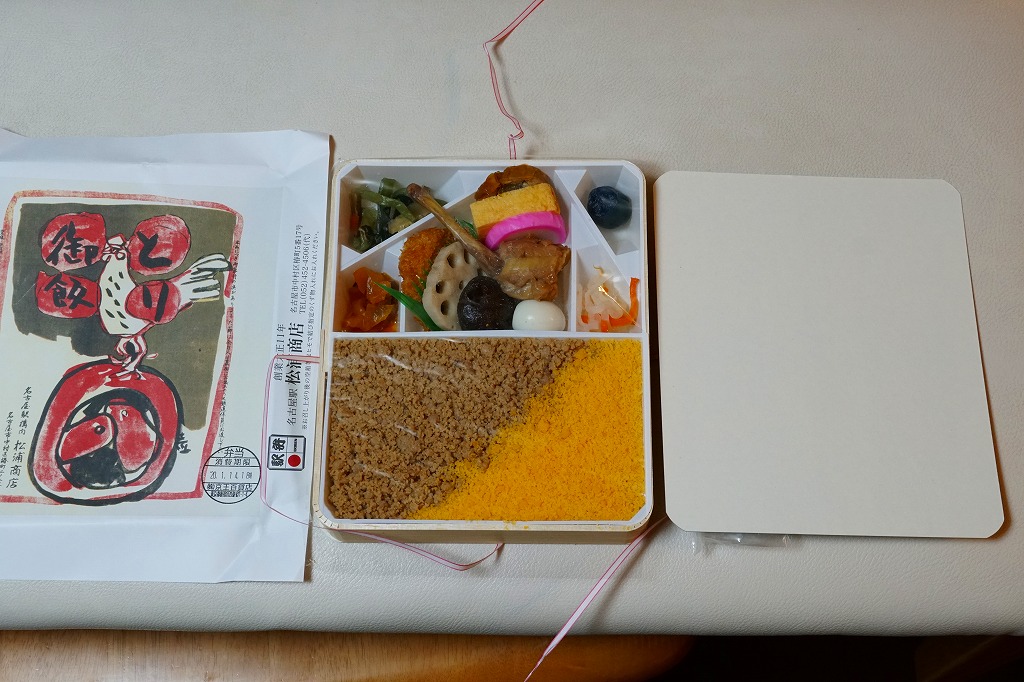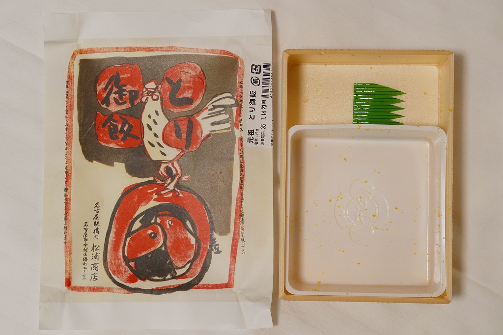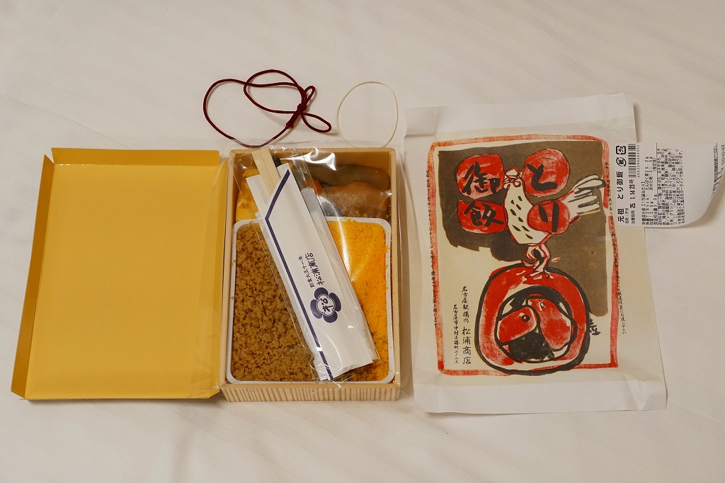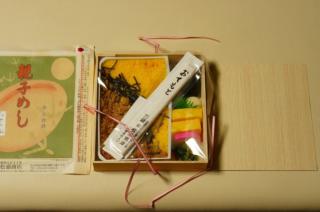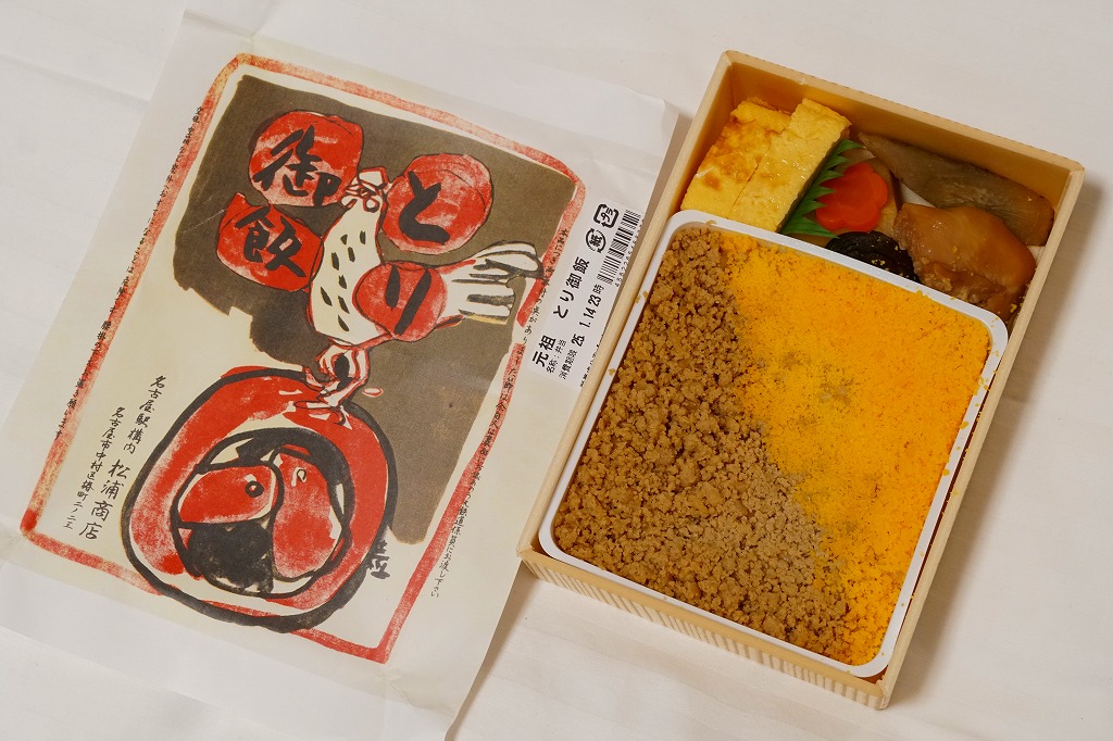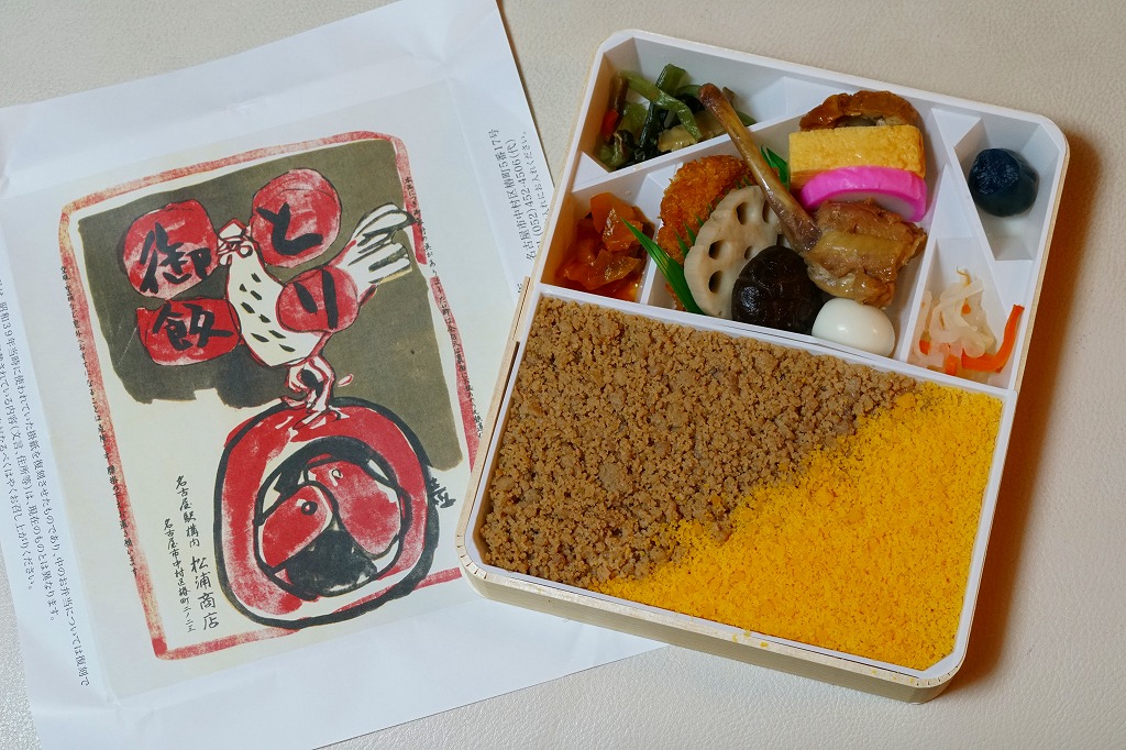 2015(平成27)年1月の阪神百貨店の駅弁大会で販売されたお弁当。実演販売のため、調製元が百貨店となっている。名古屋駅弁「とり御飯」が生まれる前の第二次大戦前の絵柄を掛紙に使用、中身はとりそぼろと玉子そぼろの親子飯に、玉子焼、かまぼこ、うずら卵、煮物など。現在のとり御飯から多くのおかずを省略した内容で、味もそんなもの。こういうとり御飯、特製でないとり御飯が、今の名古屋駅にあってもよいなと思った。