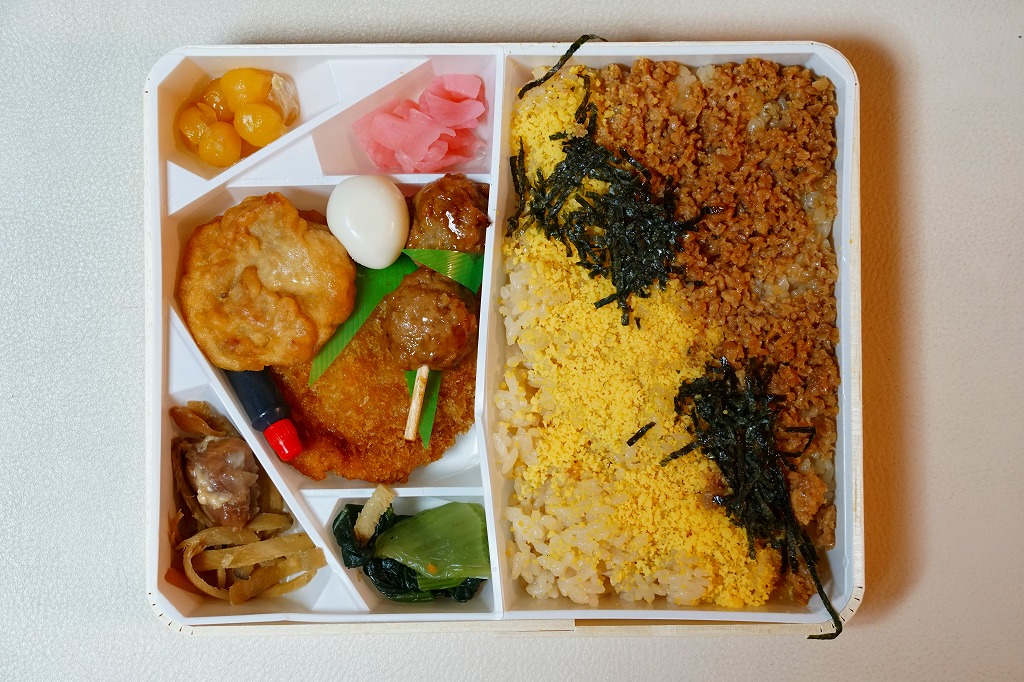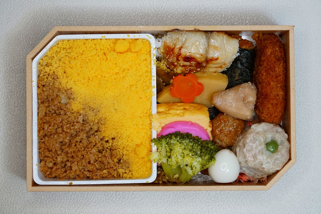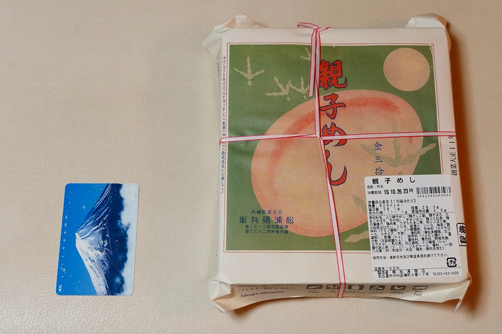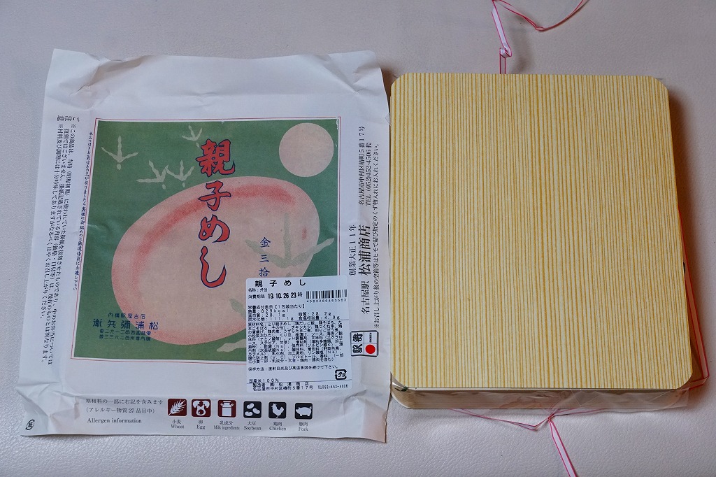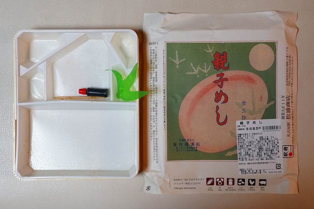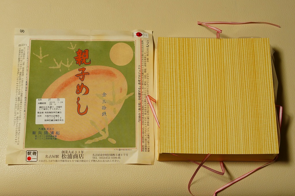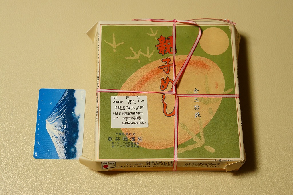 2015(平成27)年1月の阪神百貨店の駅弁大会で販売されたお弁当。実演販売のため、調製元が百貨店となっている。名古屋駅弁「とり御飯」が生まれる前の第二次大戦前の絵柄を掛紙に使用、中身はとりそぼろと玉子そぼろの親子飯に、玉子焼、かまぼこ、うずら卵、煮物など。現在のとり御飯から多くのおかずを省略した内容で、味もそんなもの。こういうとり御飯、特製でないとり御飯が、今の名古屋駅にあってもよいなと思った。