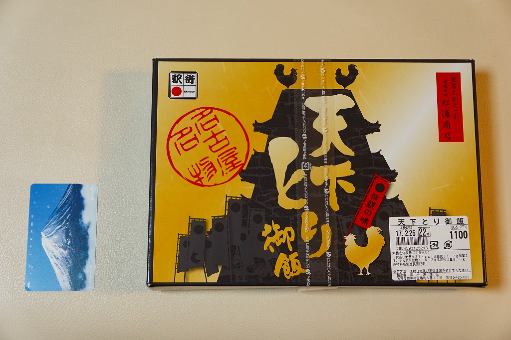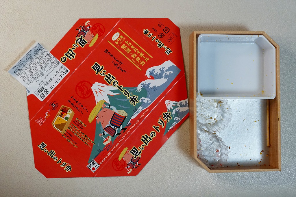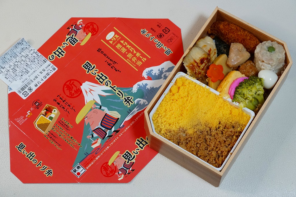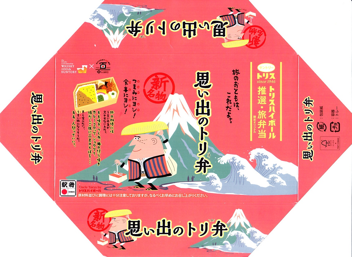 赤いふたには富士山と白波に中身の絵柄、そしてサントリーのトリスウイスキーの広告キャラクターとして65年の歴史を持つ柳原良平のイラスト「アンクルトリス」がいくつも描かれる。中身は伝統の名古屋駅弁「とり御飯」と、鶏もも焼、鶏つくね串、焼さわら、かまぼこ、玉子焼、しゅうまい、カレーコロッケ、鶏肉の磯辺揚げ、ブロッコリー、タケノコやニンジンなどの煮物、きんぴらごぼう、うずら卵、梅バンバンジーの詰合せ。鶏づくしと、名古屋駅弁の伝統と、幕の内駅弁の構成を、コンパクトに折り重ねた実力派。しかし2024年の春頃で終売。