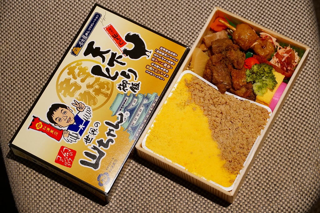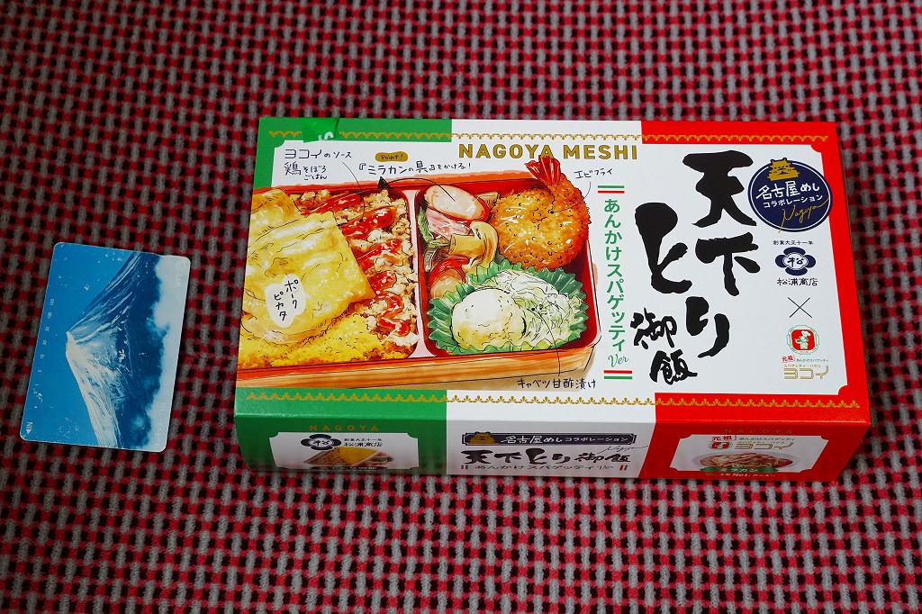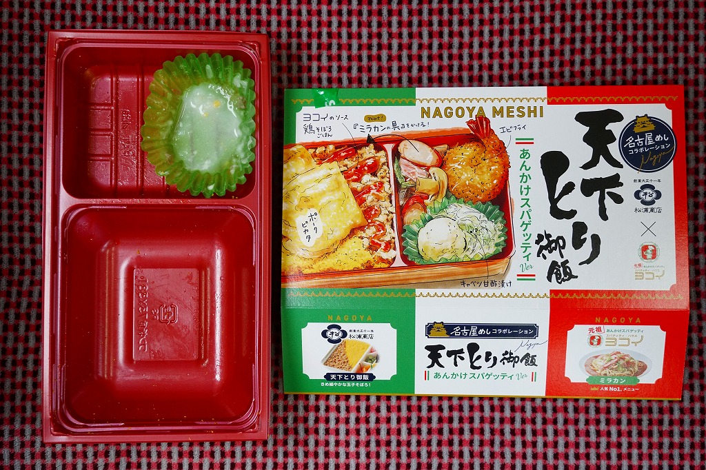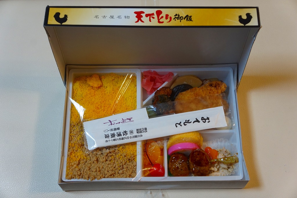 天下とり御飯より小さく深い、幕の内駅弁ではなく催事向け輸送駅弁でもよく使われる形のプラ容器を、中身のイラストとトリコロールでできたスリーブにはめる。鶏のだし汁で炊いた御飯を、とり御飯の細かい炒り卵と、そうでなくヨコイのソースをかけた粗い鶏そぼろと、ポークピカタで覆い、ポテトサラダ、キャベツ甘酢漬け、エビフライ、ミラカンの具というウインナーやハムやベーコンやタマネギやピーマンやマッシュルームなどの炒め物を添える。いずれも名古屋のものというだけで、スパゲティの具に鶏と卵のそぼろ飯を組み合わせた大いなるミスマッチも、食べれば不思議と合いそうな洋食弁当に思える。通常版の天下とり御飯も引き続き、東京には来ないが名古屋駅で売られる。