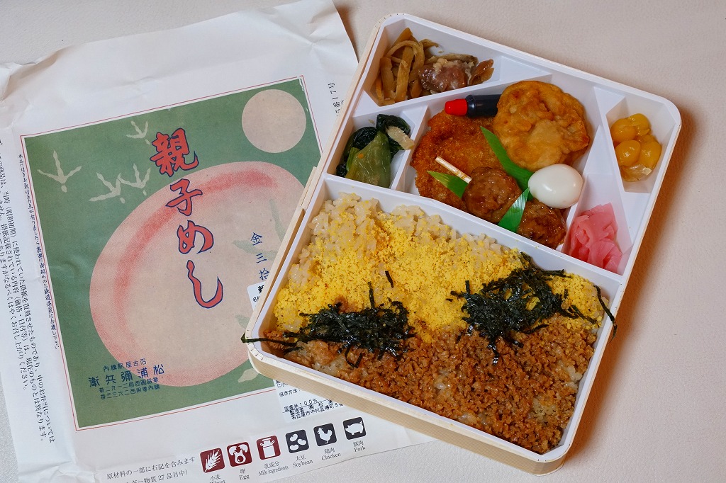 1955(昭和30)年頃あるいは1937(昭和12)年発売の「親子めし」をルーツに持つ、名古屋駅で伝統の駅弁。古くは通常版と、おかずの多い特製版があったが、現在はこの特製版のみを販売。2016(平成28)年4月頃に名前が「天下とり御飯」となった。容器のふたでは名古屋城を鶏で描く。