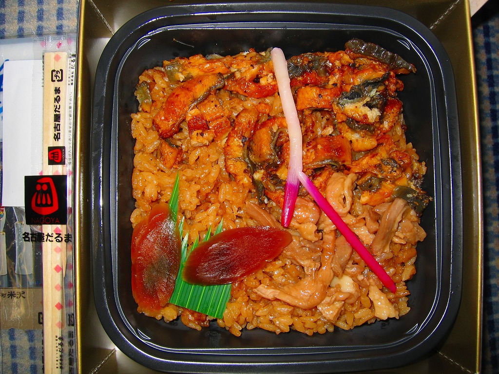 2004(平成16)年の秋に発売か。「抹茶ひつまぶし日本一弁当」と同じタイプの、強度のあるボール紙の正方形の容器を使用、駅弁の名前を記した紙帯で締める。中身はタレ御飯の上に純系名古屋コーチンの鶏肉が少々と、三河一色産のうなぎひつまぶし(鰻蒲焼の刻み)がそこそこと、守口漬が二切れ。濃厚な味が楽しめると同時に、外観も中身も価格も名古屋経済の元気さを象徴しているよう。