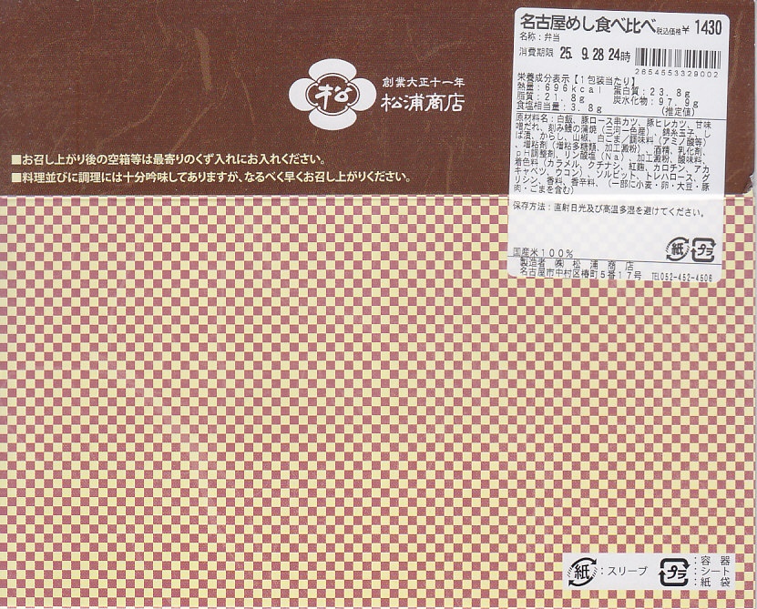 なお、2000年頃にはとり御飯・みそかつチキン・チキン照焼・エビフライ・きしめんサラダ・守口漬など名古屋名物を欲張りに詰め込んだ「なごや一番(1,100円)」という駅弁が出ていた模様。今回収蔵の駅弁はこれのリニューアル版という扱いらしい。2007年頃までの販売か。