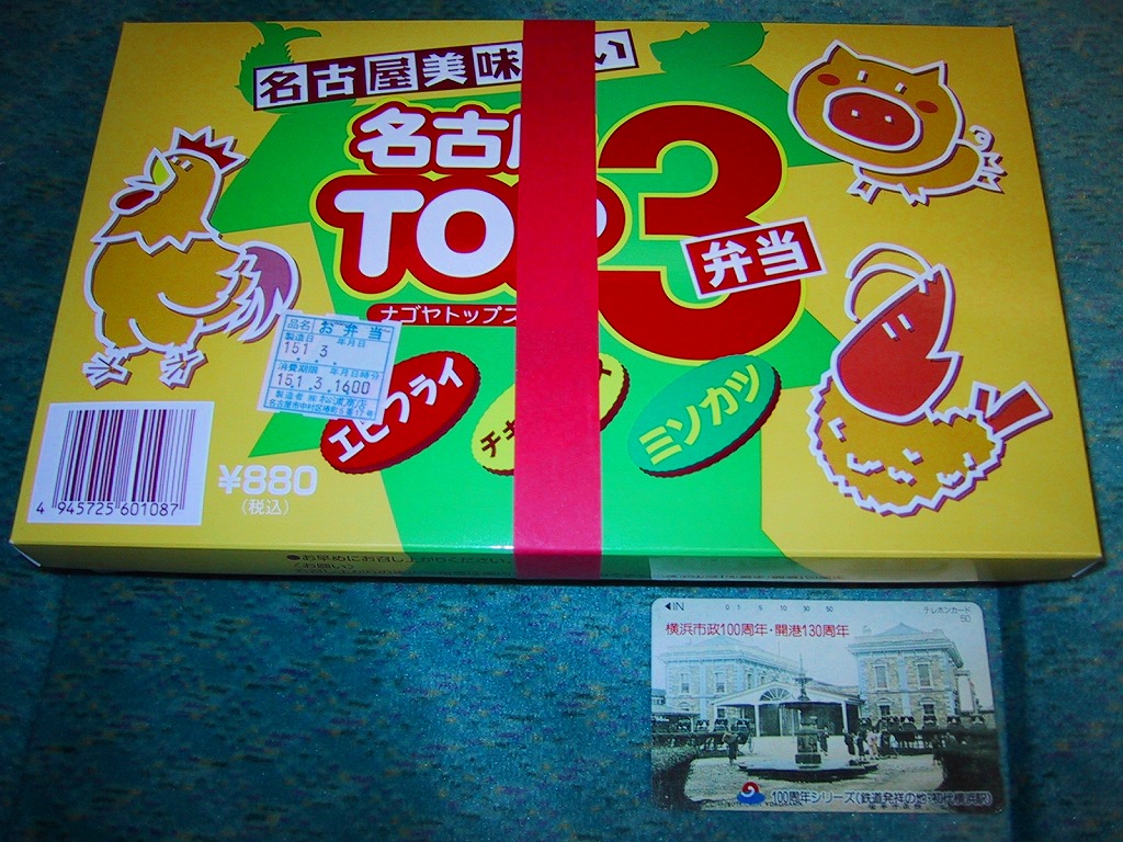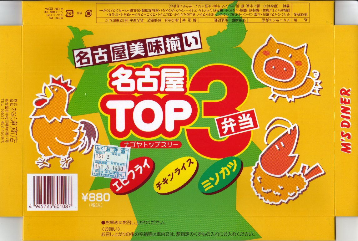 商品名は「名古屋トップスリー」とも。トレーを入れた紙箱を紙帯で留める。中身はエビフライ・名古屋コーチン入りチキンライス・味噌カツと名古屋三大名物が入り、フライドポテトやカップゼリーなども入る、非常に分かりやすい若者向けな洋風弁当。価格は2003年の購入時で880円、2014年4月の消費税率改定で900円。、2017年時点で930円。2017年頃までの販売か。