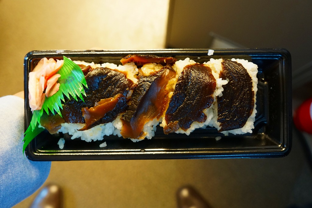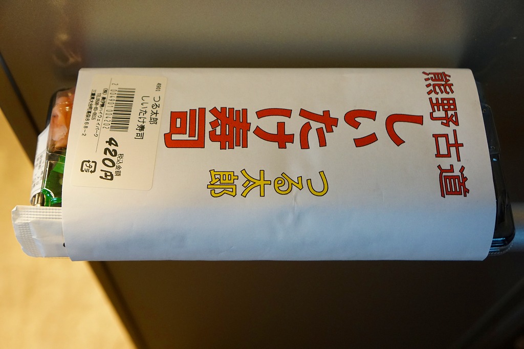 紀勢自動車道の奥伊勢パーキングエリアで買えたお弁当。高速道路会社の「速弁」ではない。惣菜向けの黒いトレーに、酢飯を敷き、シイタケ煮を並べ、ガリを添えて、商品名のみをコピー用紙にインクジェット印刷した掛紙を巻く。調製元はパーキングエリアの運営会社となっているが、商品名と掛紙に記される「つる太郎」で検索すると、三重県多気郡大台町の国道42号沿いの食堂と、これと同じ名前と中身の商品が出てくる。