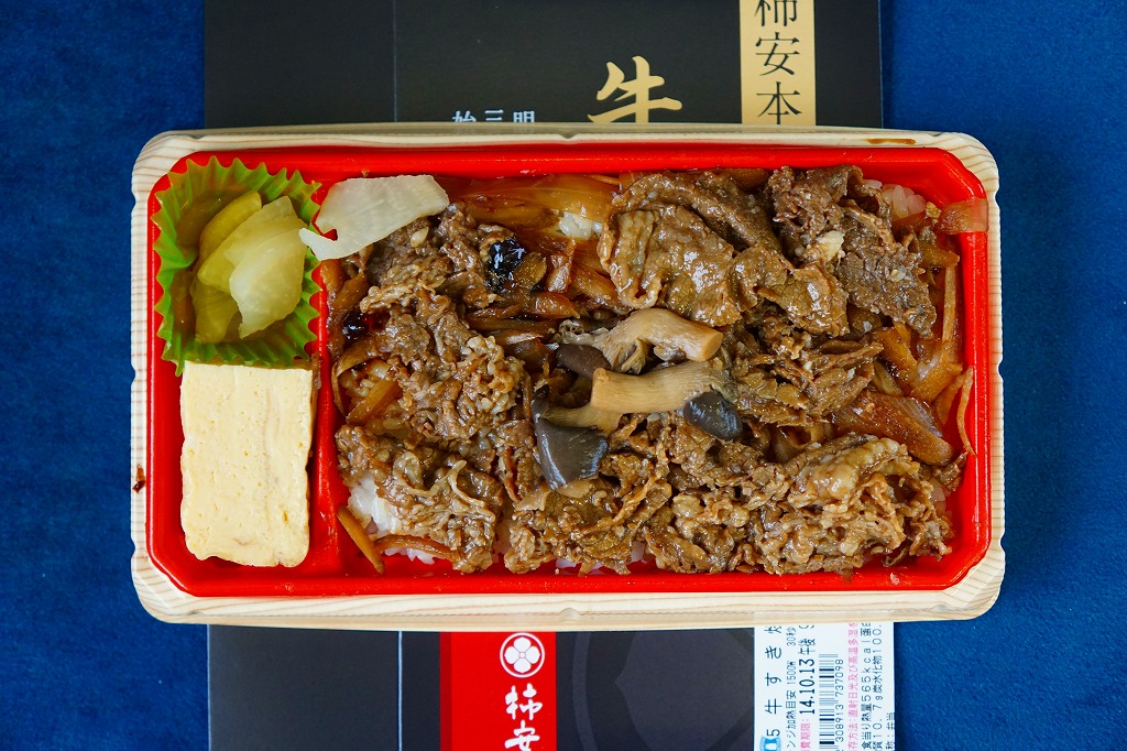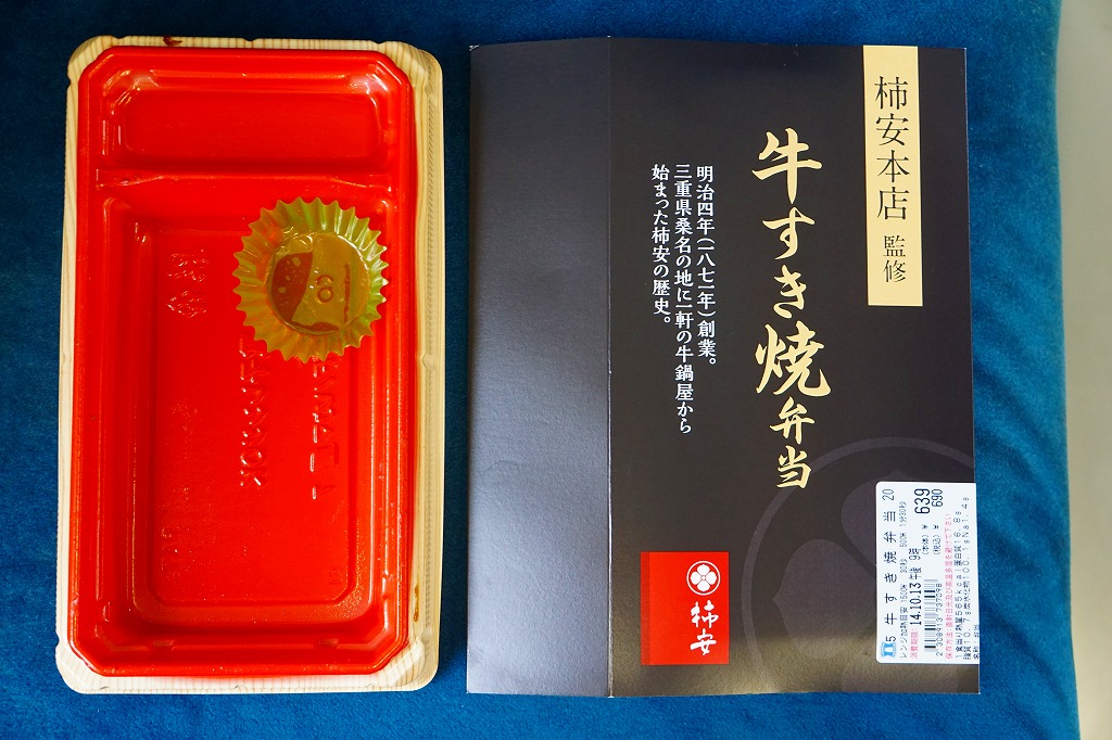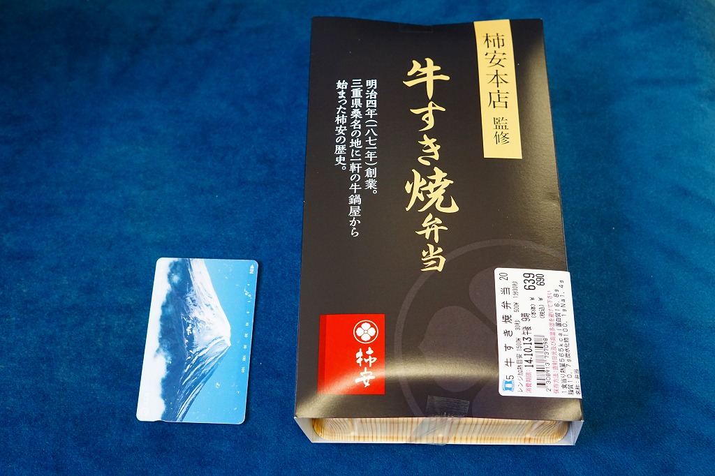 2014(平成26)年10月7日から4週間、全国のローソンで販売。コンビニエンスストア大手のローソンが、同じく全国にチェーン展開する牛肉等惣菜屋の柿安本店が監修する、弁当、おにぎり、手巻寿司の3品を販売したもの。黒いスリーブに収めた長方形の容器に白飯を詰め、牛すき焼で覆い、玉子焼と漬物を添えるその姿は、まるで駅弁そのもの。駅売店も駅弁屋も開いていない朝の亀山で、列車に乗る前に車中食として、つまり駅弁と同じ目的で買った。駅弁とは何かを考える材料として、三重県内で買ったことと、柿安の発祥地が三重県桑名なので、三重県のページに収蔵。