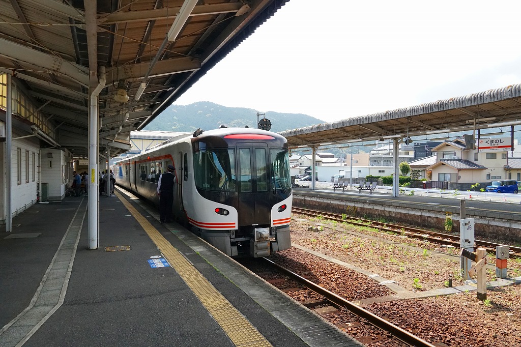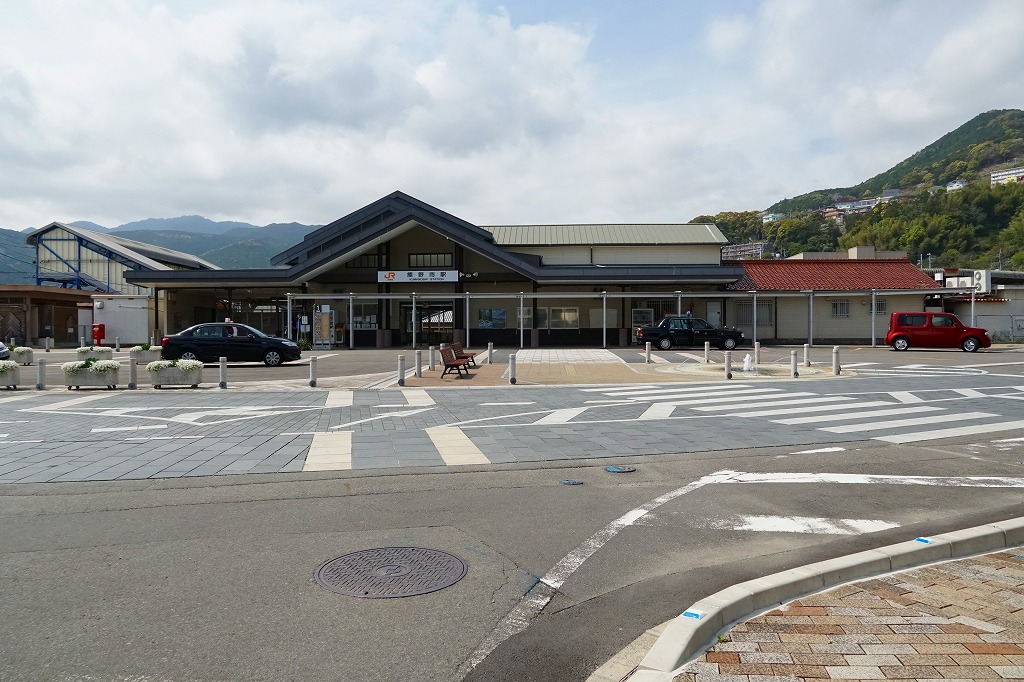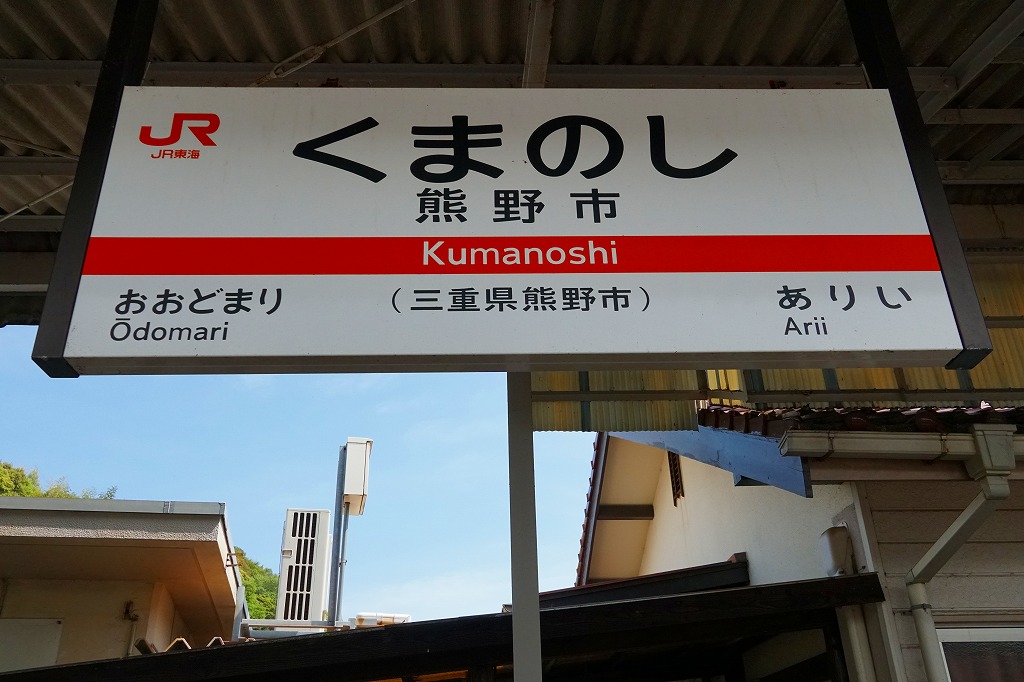 名古屋駅から特急列車「南紀」で3時間強。熊野市は三重県の南部で太平洋の熊野灘に面した、人口約1.5万人の港町。七里御浜の付近を除き険しい地形の様々が名所と紹介されたり、今は2004年登録の世界遺産「紀伊山地の霊場と参詣道」が推される。駅弁は1960年代から2000年代まで、新宮駅と同じものが売られた。1940(昭和15)年8月8日開業、三重県熊野市井戸町。