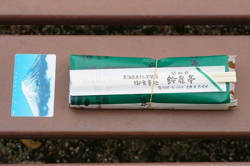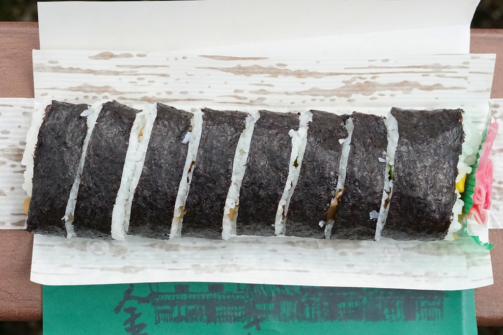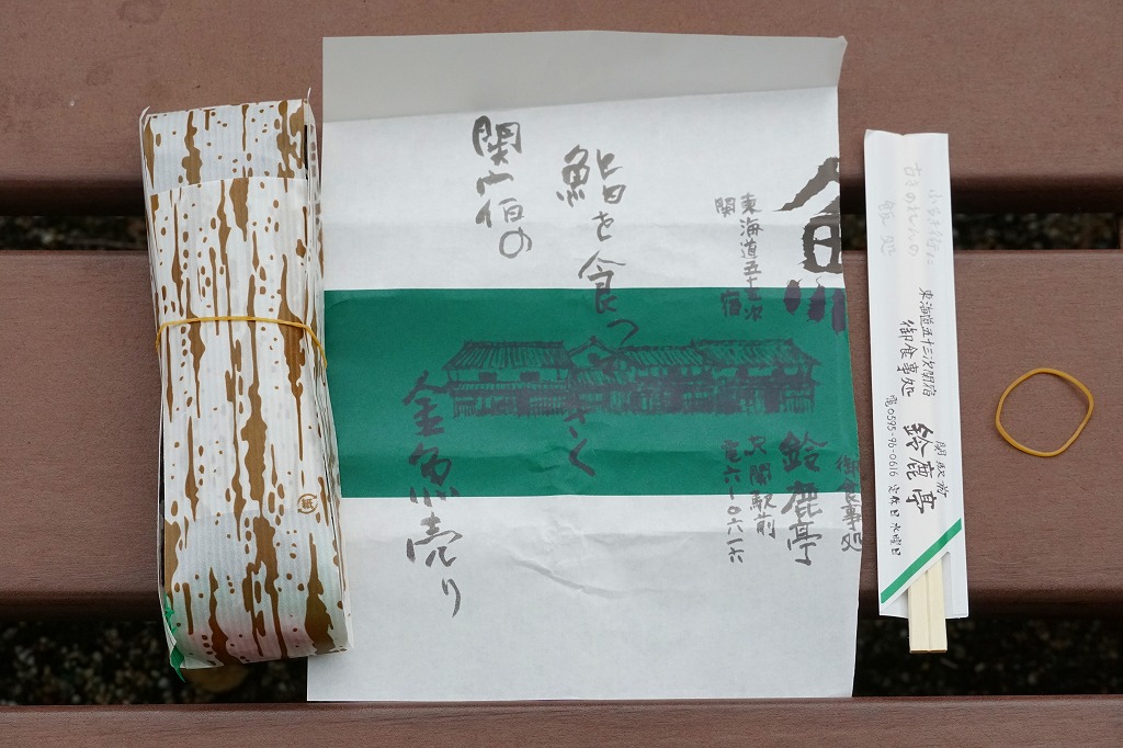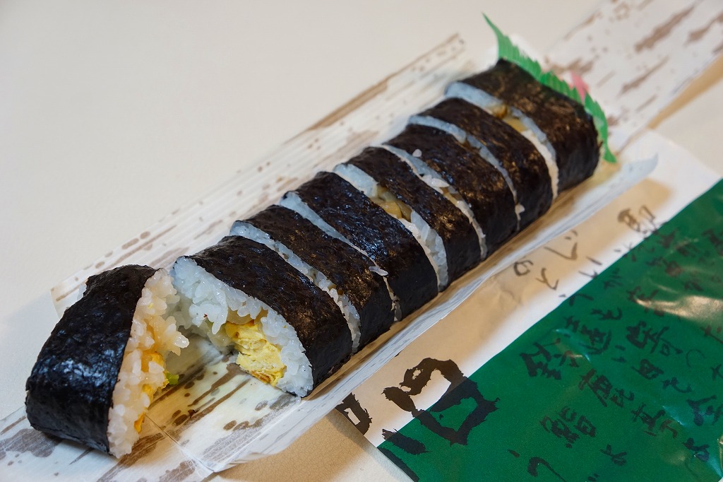 三重県のJR西日本の関駅の駅舎で、正確には駅舎代わりの亀山市施設「関宿ふるさと会館」の、売店と待合室と軽食堂か喫茶店を兼ねた店舗で売る巻寿司。駅弁として紹介されることはないが、駅の中で買える商品であるほか、駅近くの重要伝統的建造物群保存地区の関宿を紹介するチラシやガイドブックには、ここの名物としてたいてい載っていると思う。調玉子焼とかんぴょうときゅうりのみを巻いた太巻きを、竹皮柄の紙で包み、寿司店の包装紙で包む。とてもふんわり柔らかく、駅弁や惣菜でなく寿司店の寿司飯が心地良い。外観や中身に特徴がないのに、この風味は記憶に残る。調製元は関駅の目の前の寿司店。水曜定休。