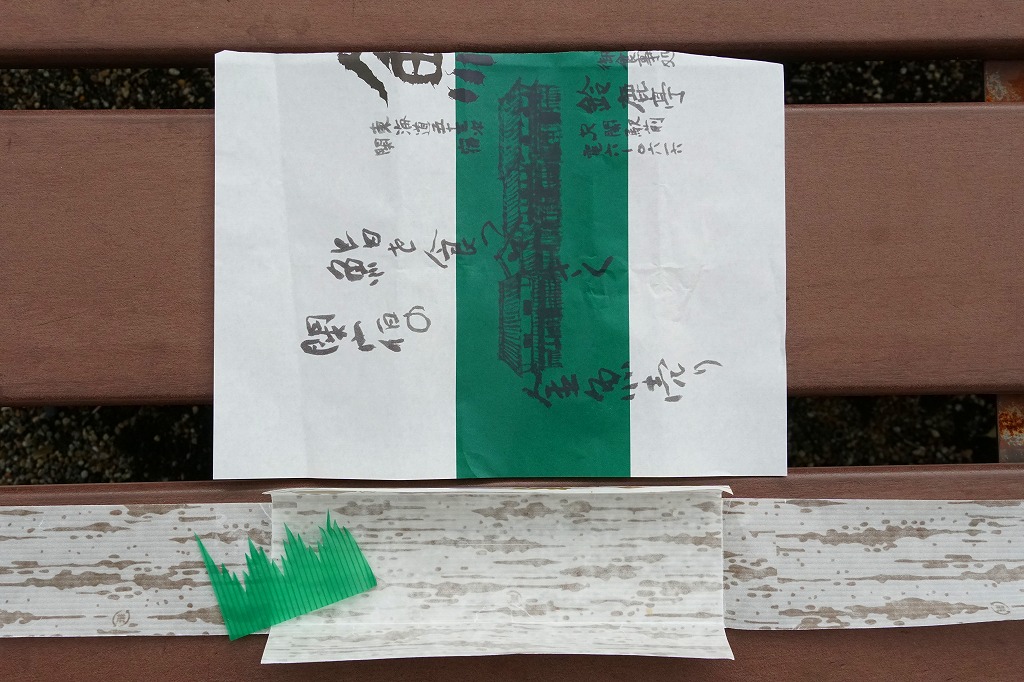 2017(平成29)年2月25日に購入した、関駅弁の包装紙。上記の2023年のものと、価格を除きすべてが変わらない。偶然にも前回と今回で包装紙の絵柄がつながり、この寿司店で使う絵柄の全体が見えた。
