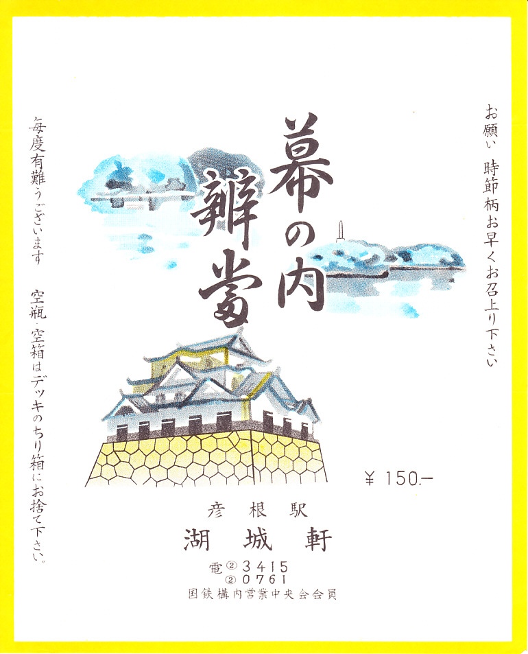 1960年代のものと思われる、昔の彦根駅弁の掛紙。絵柄は彦根城と、おそらく琵琶湖に浮かぶ多景島(たけしま)と誓の御柱、 あとは何だろうか。彦根駅では1900年代から1990年代まで駅弁が売られたが、1960年代にとりめしとちらしずしがあった以外は、幕の内弁当のみを販売したらしい。