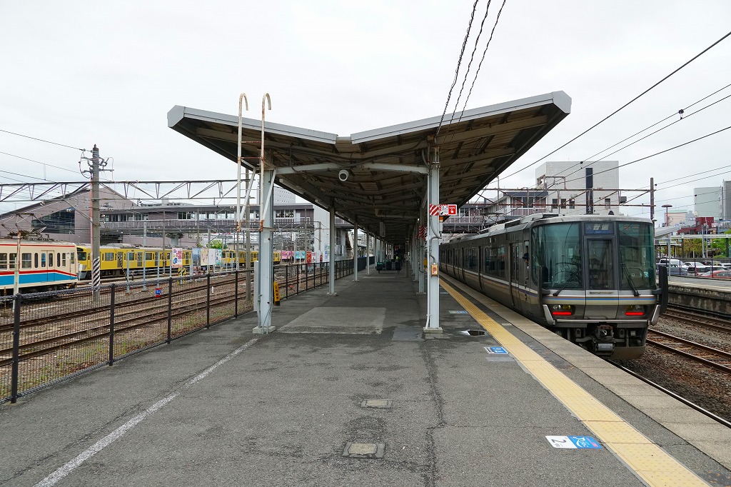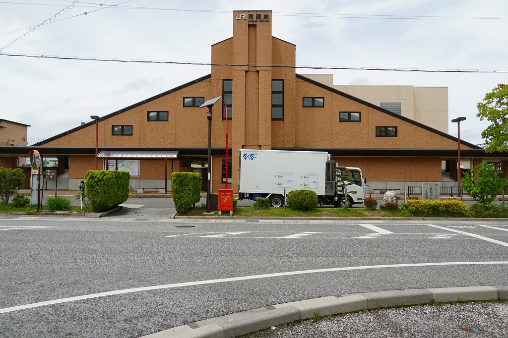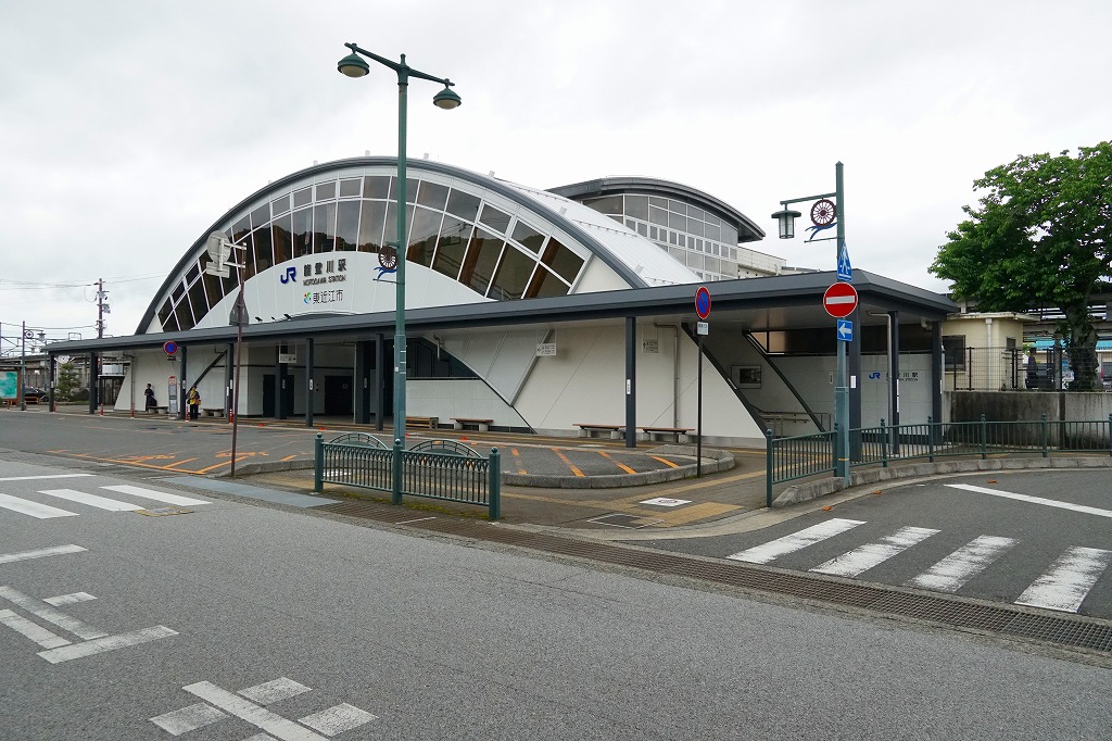 米原駅から電車で3駅11分。橋上駅舎も東西駅前も都市近郊のたたずまいであるが、明治時代から3世紀にまたがる歴史の古い駅であり、西側に見える荒神山(こうじんやま)には古墳があり土器が出土した。当時市販の鉄道時刻表では1921年時点で駅弁販売駅であったが本当だろうか。1896(明治29)年5月1日開業、滋賀県彦根市南川瀬町。