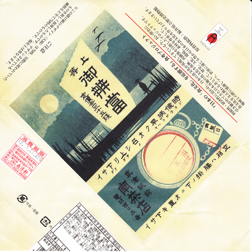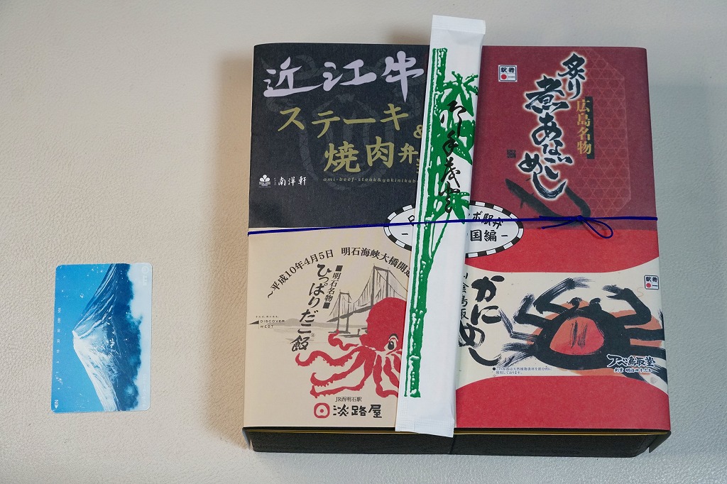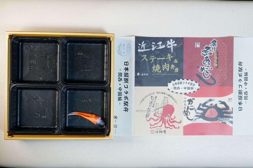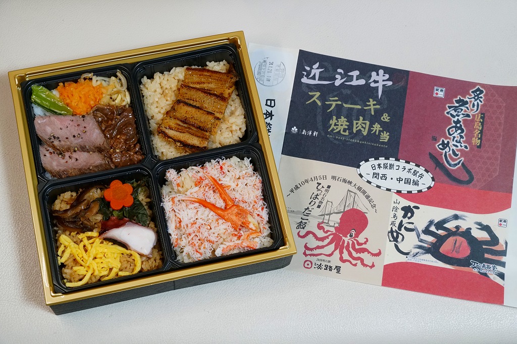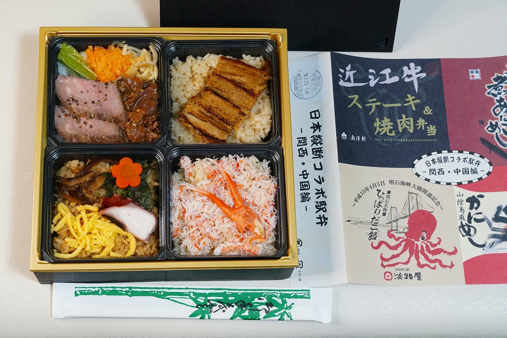 この関西・中国編は、滋賀県の草津駅「近江牛ステーキ&焼肉弁当」と、広島県の広島駅「炙りあなごめし」と、鳥取県の鳥取駅「山陰鳥取かにめし」と、兵庫県の西明石駅「ひっぱりだこ飯」の詰合せ。大きな掛紙には、その4種類の駅弁の掛紙の一部や縮小版をタイル状に組み合わせた。中身も正方形の4区画で、それぞれの御飯の部分を詰合せ。味も当然に、それらと同じ。
