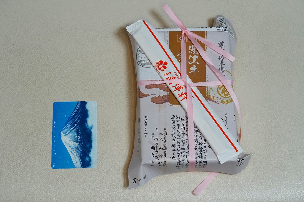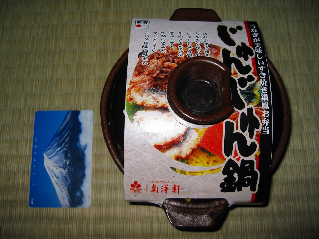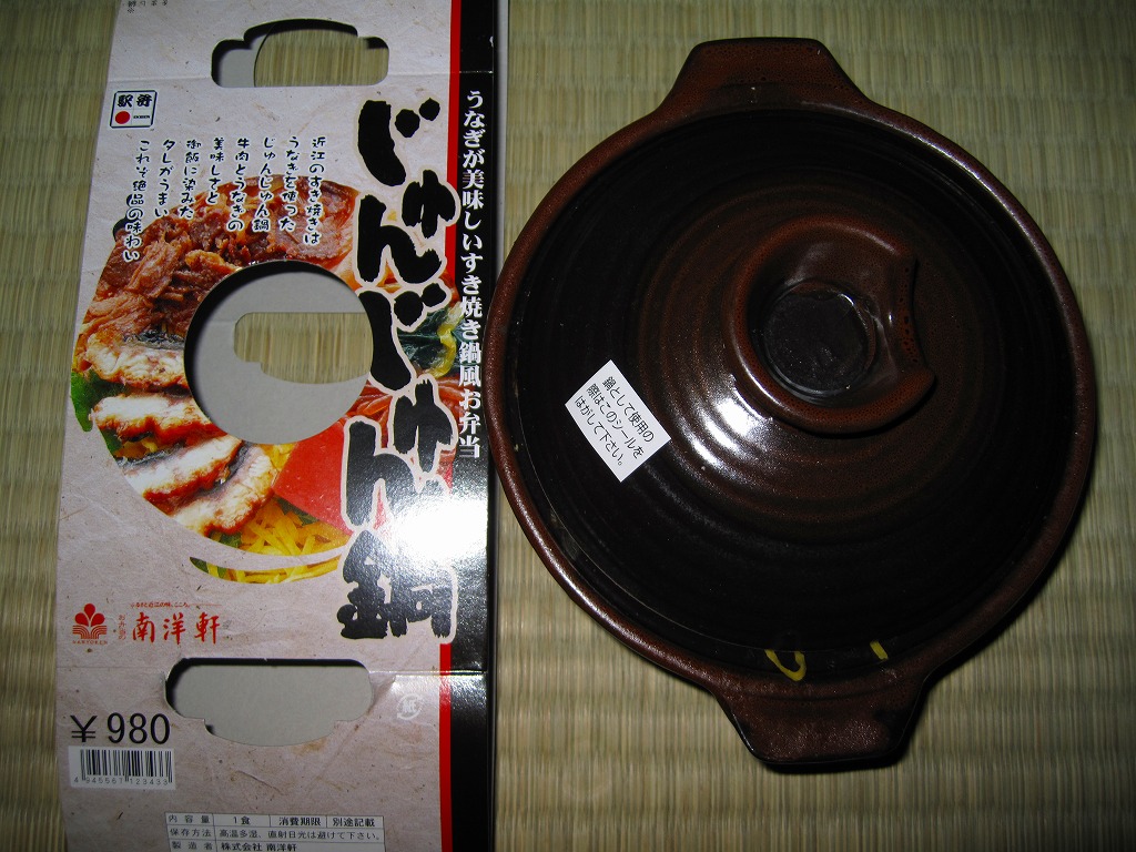 確かにすき焼き鍋の雰囲気がたっぷり。分量は少量だけれども、容器の質感も含めてお腹いっぱいにしてくれる。草津駅のような駅弁の実需がなくなった駅ではなく、東海道新幹線「のぞみ」停車駅で出ていれば、もっと話題を呼んだのではないかと思う。すき焼きを「じゅんじゅん」と呼んだり、具にウナギや赤コンニャクを入れる点は、琵琶湖の南西側の滋賀県では当たり前のことである模様。