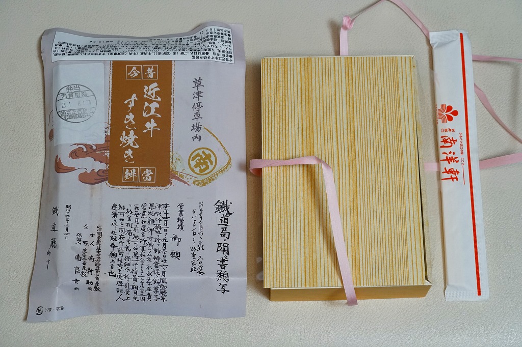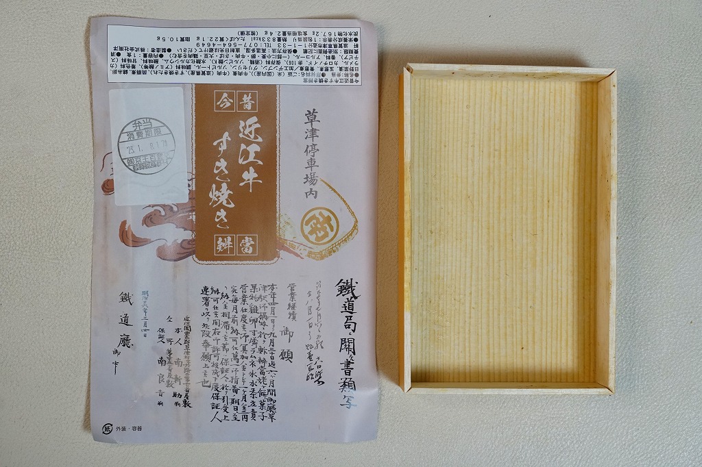 2022(令和4)年10月8日に「復刻近江牛すき焼き弁当」の名前で、草津駅と京都駅と新大阪駅で発売、23日まで販売。日本鉄道構内営業中央会の鉄道開業150年記念復刻駅弁企画により、同月から期間限定で販売された31社34駅弁のひとつ。その後もスーパーやデパートの駅弁催事で売られ、年が明けた1月の京王百貨店の駅弁大会にも出てきた。掛紙の絵柄はおそらく、昔風に作った上半分と、調製元に残る古い承認願を、1889(明治22)年7月1日承認の営業許可の継続について1893(明治26)年3月4日付で鉄道庁へ提出した書類の写しを転記した下半分。