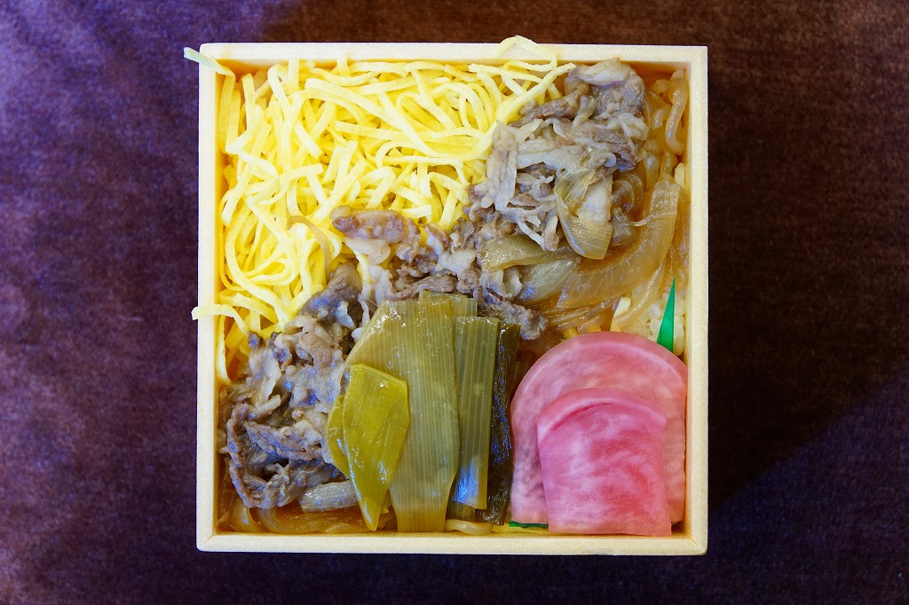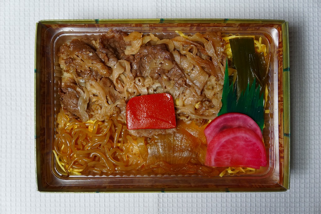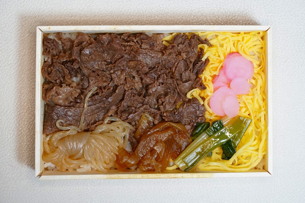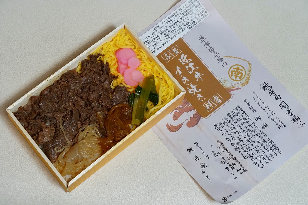 2013(平成25)年の発売。草津駅で予約を要せず買うことができる、数少ない駅弁のひとつ。小柄な容器に白飯を詰め、牛焼肉と錦糸卵で覆い、ネギ、タマネギ、糸こんにゃく、大根桜漬を添える。東京や大阪で賑やかな上記や下記の駅弁で食べた味が、そのままコンパクトに詰まっていた。価格は2013年の発売時や2017年の購入時で520円、2020年時点で580円、2023年時点で650円。2023年までの販売か。