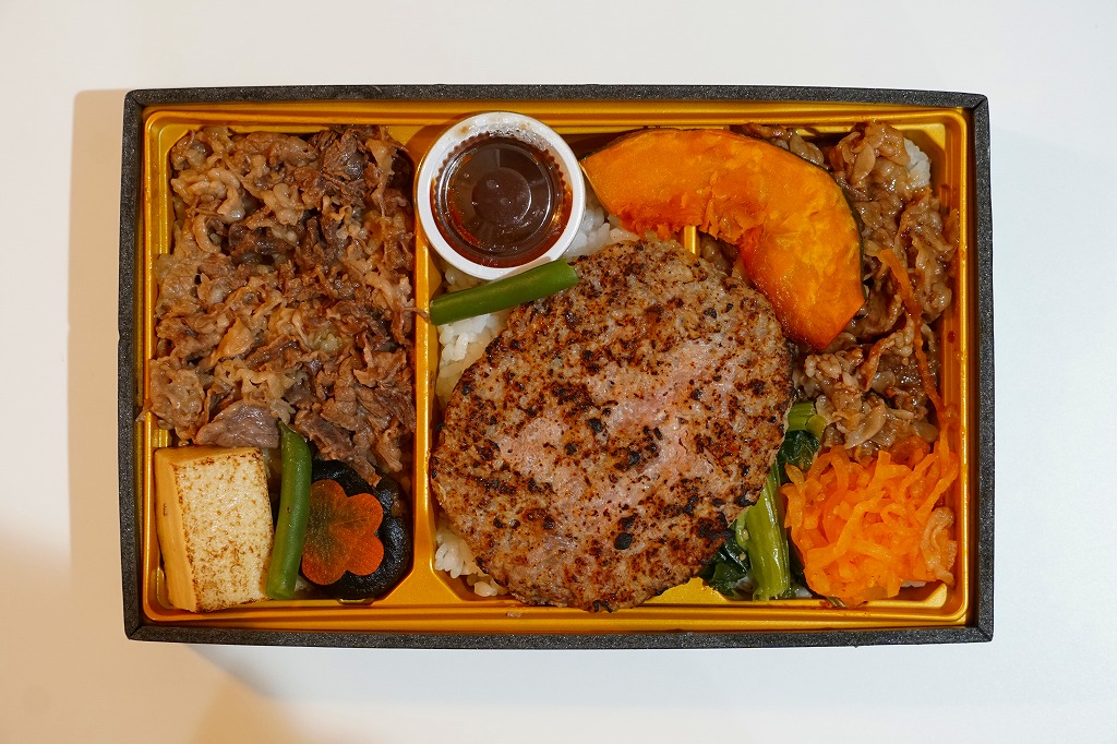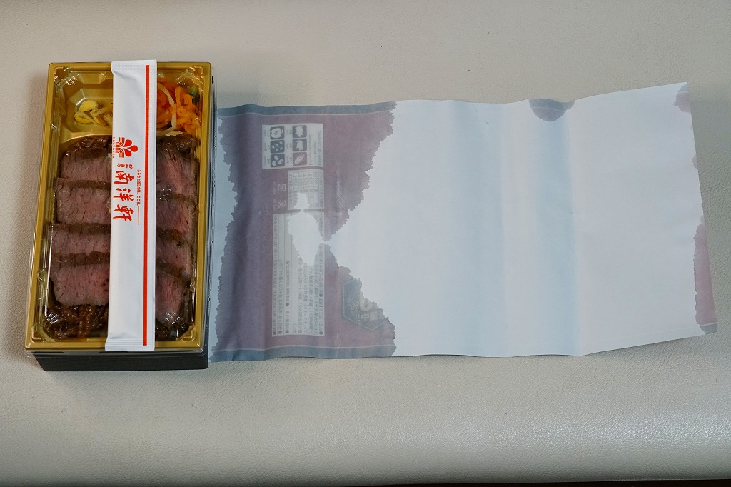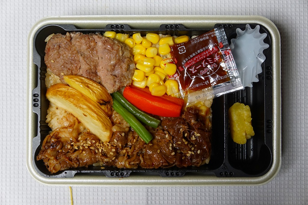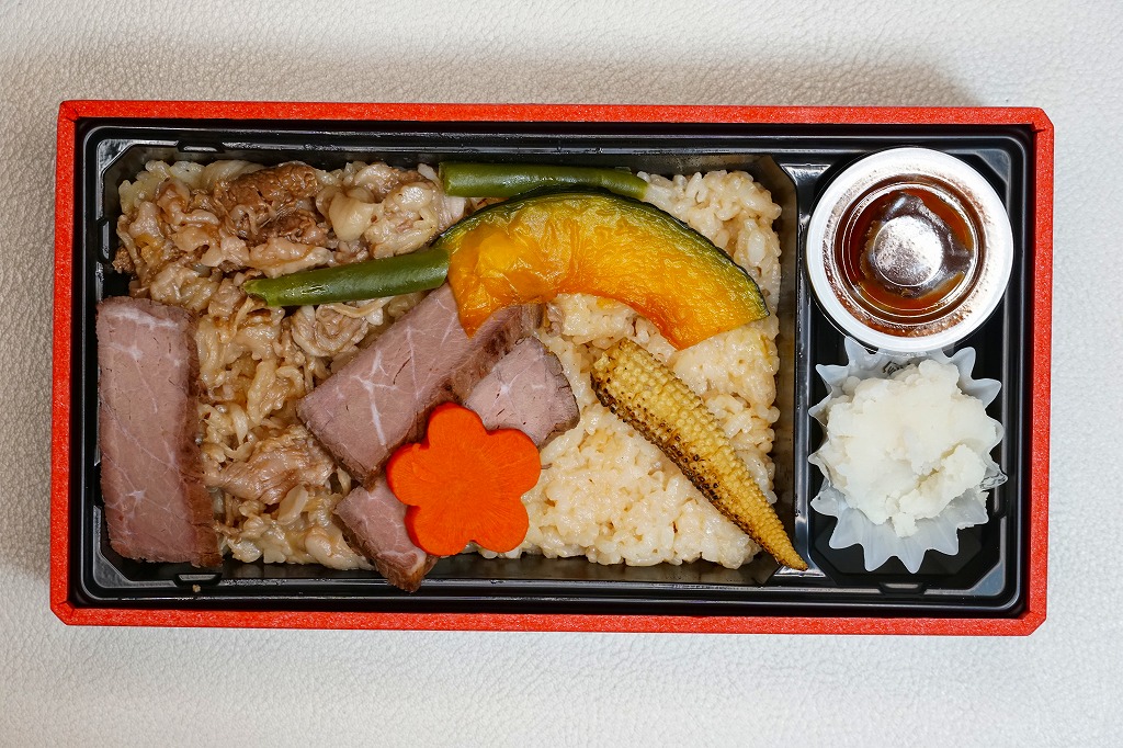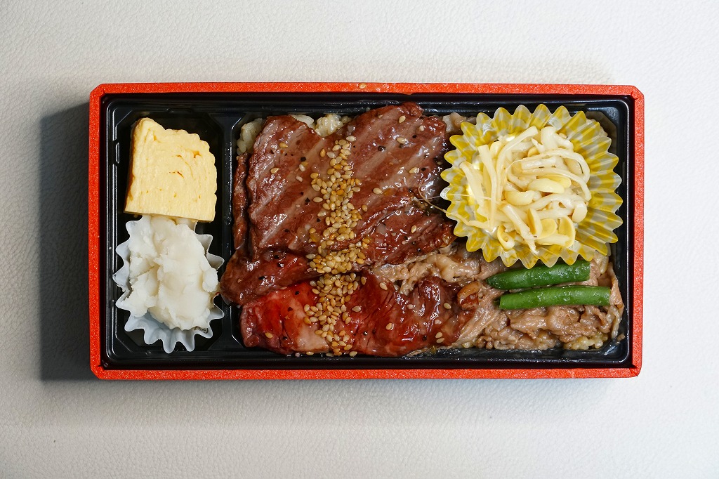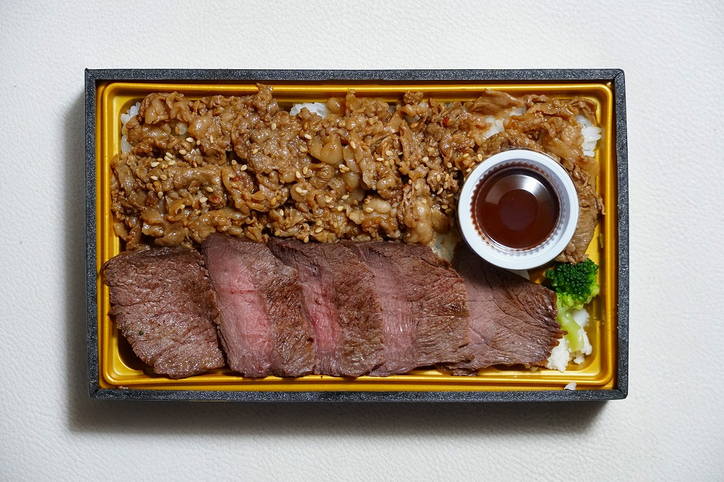 2020(令和2)年12月の東武百貨店池袋店、2021(令和3)年2月の鶴屋百貨店の駅弁大会、2022(令和4)年1月の京王百貨店の駅弁大会で実演販売。催事場での実演販売の専用商品と考えられる。中身は白飯を牛ステーキと牛焼肉で覆うもの。ブロッコリーの小片とタレも添付するが、事実上肉と飯。値は張るけれど、もし駅で売られる弁当でなくても、赤身も脂身もほどほどの牛肉をたくさん食べられて、焼き立てでなくても味わえる、催事に来て満足できる商品であると思った。以後もデパートの駅弁大会での実演販売が続き、価格は2020年時点で1,800円、2023年時点で1,850円、2024年時点で1,950円、2025年時点で1,960円。