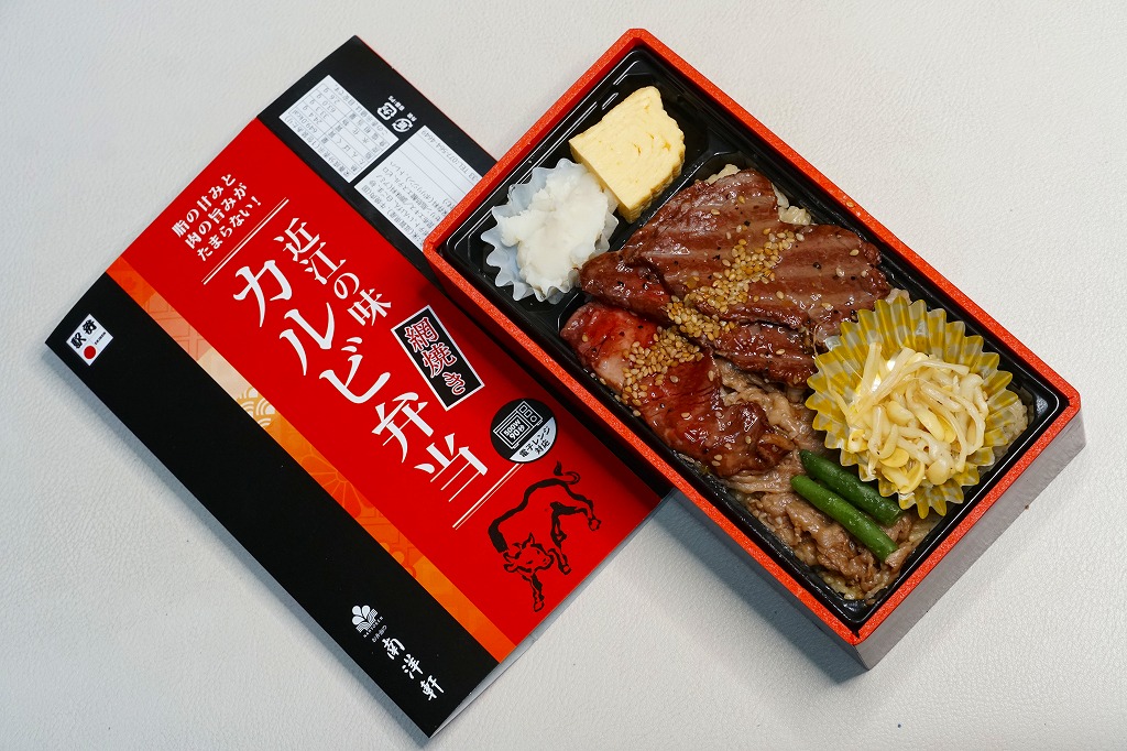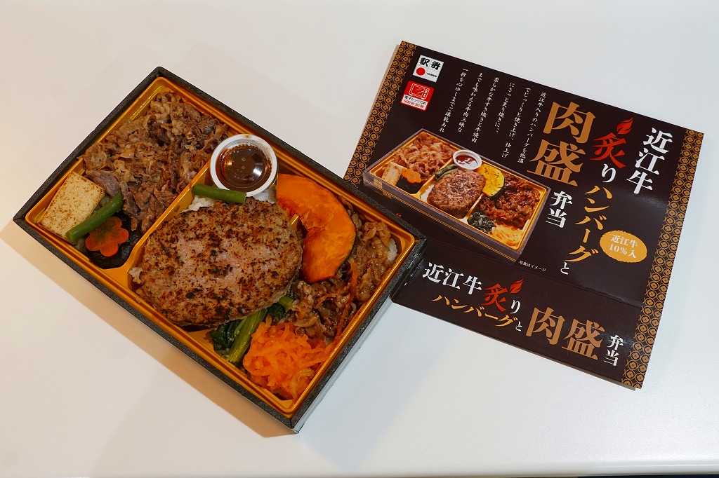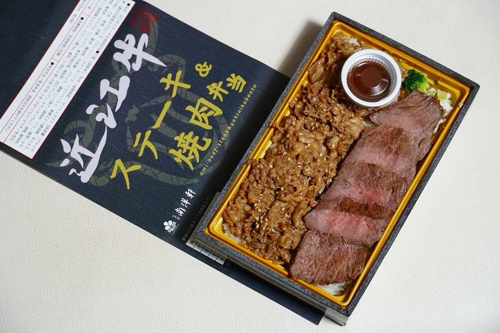 2024(令和6)年1月の京王百貨店の駅弁大会で実演販売。同催事で6種類を販売した「贅沢盛り新作駅弁」のひとつとして、近江牛ステーキと焼肉を「近江牛ステーキ&焼肉弁当」より「今だけ肉60%増量中」とした。長方形のプラ容器に白飯を詰め、近江牛のステーキを4枚並べ、その焼肉ですき間を埋め、ナムルを添える。東京でこれだけの霜降り肉を食べられる弁当としては値段が手頃に思え、催事場でもよく売れていた。草津駅で売られることはないだろうが、京都駅か新大阪駅に出てくるかどうか。2025年1月の京王百貨店の駅弁大会では「近江牛極スペシャル」の名前で、肉を6切れにして実演販売。
