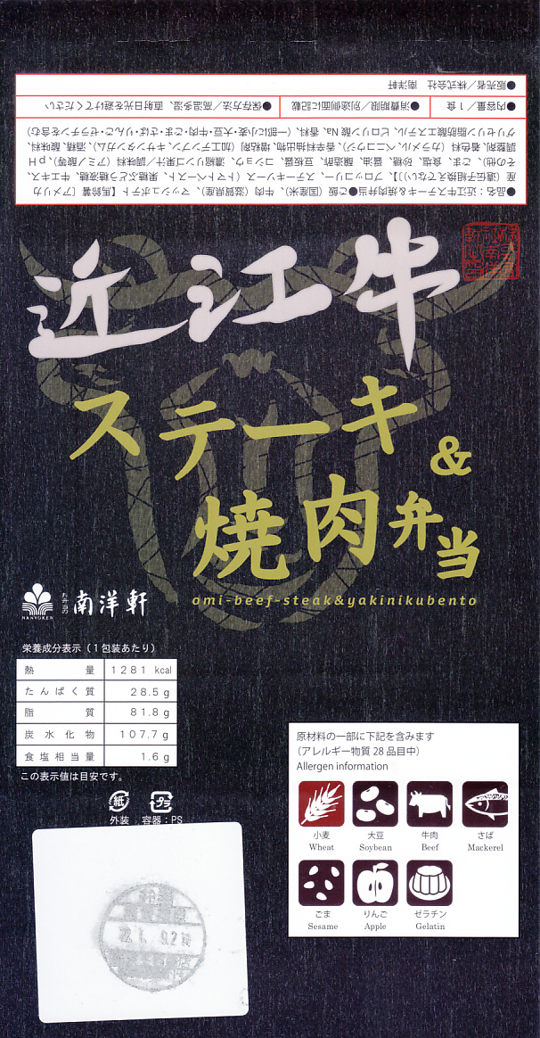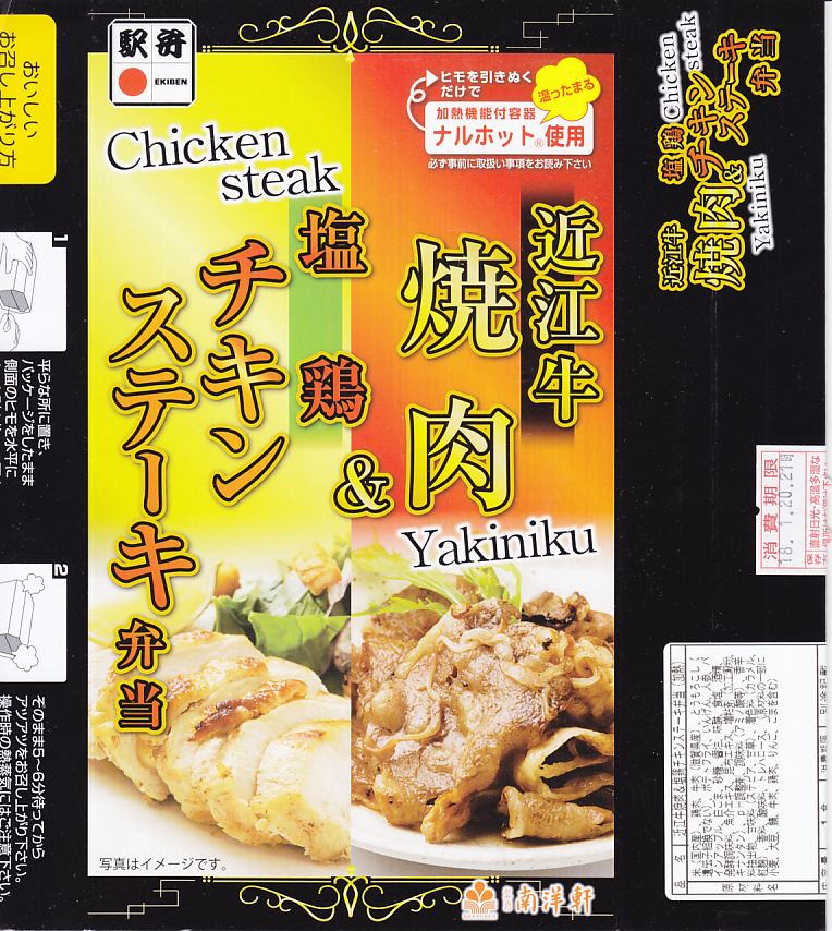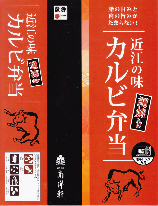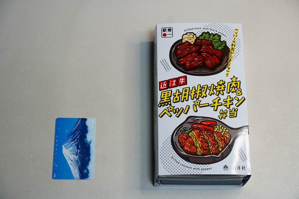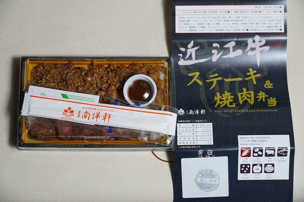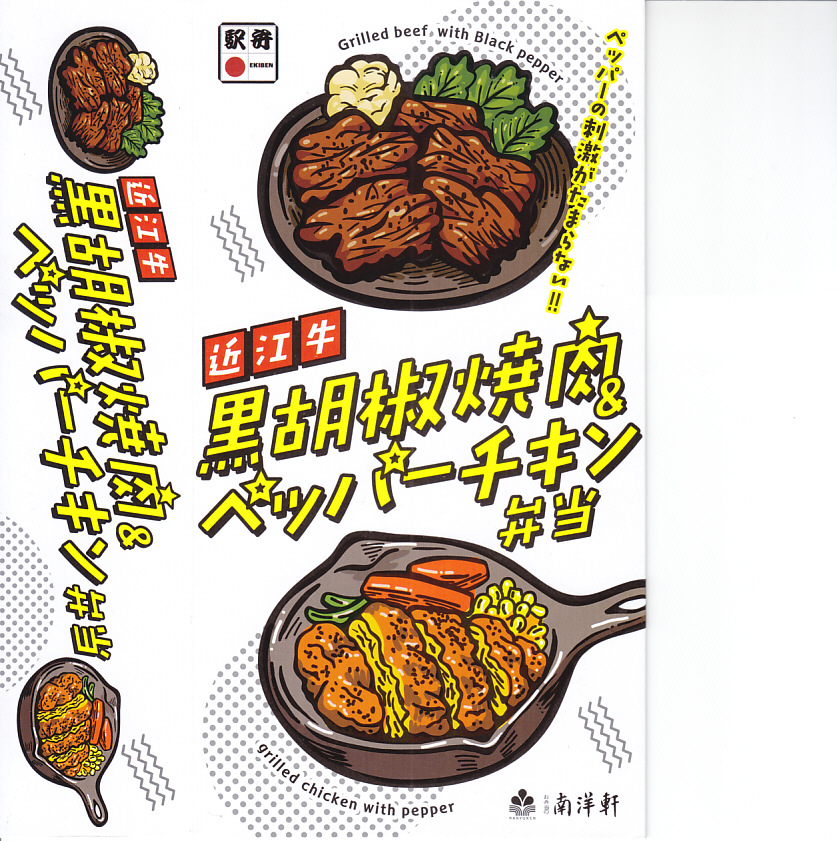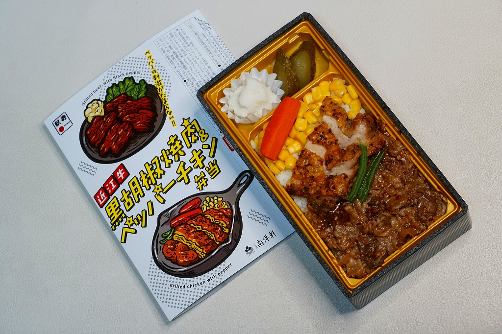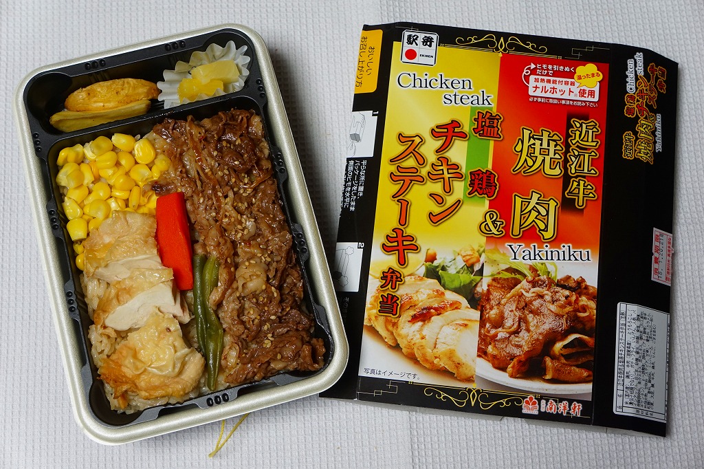 2016(平成28)年1月までに発売か。長方形の加熱機能付き容器に茶飯を詰め、駅弁の名前どおりの近江牛焼肉と塩鶏チキンステーキで半分ずつ覆い、ニンジンとインゲンで仕切り、コーンとポテトとパインを添える洋食弁当。牛焼肉はまあまあ、照焼のスライスのような形状の塩鶏3個は、ほんのり塩気の薄味と、柔らかくヘルシーな印象の身がとても美味だった。価格は2016年の発売時や購入時で1,190円、2020年時点で1,280円、2023年時点で1,440円、2024年時点で1,600円。